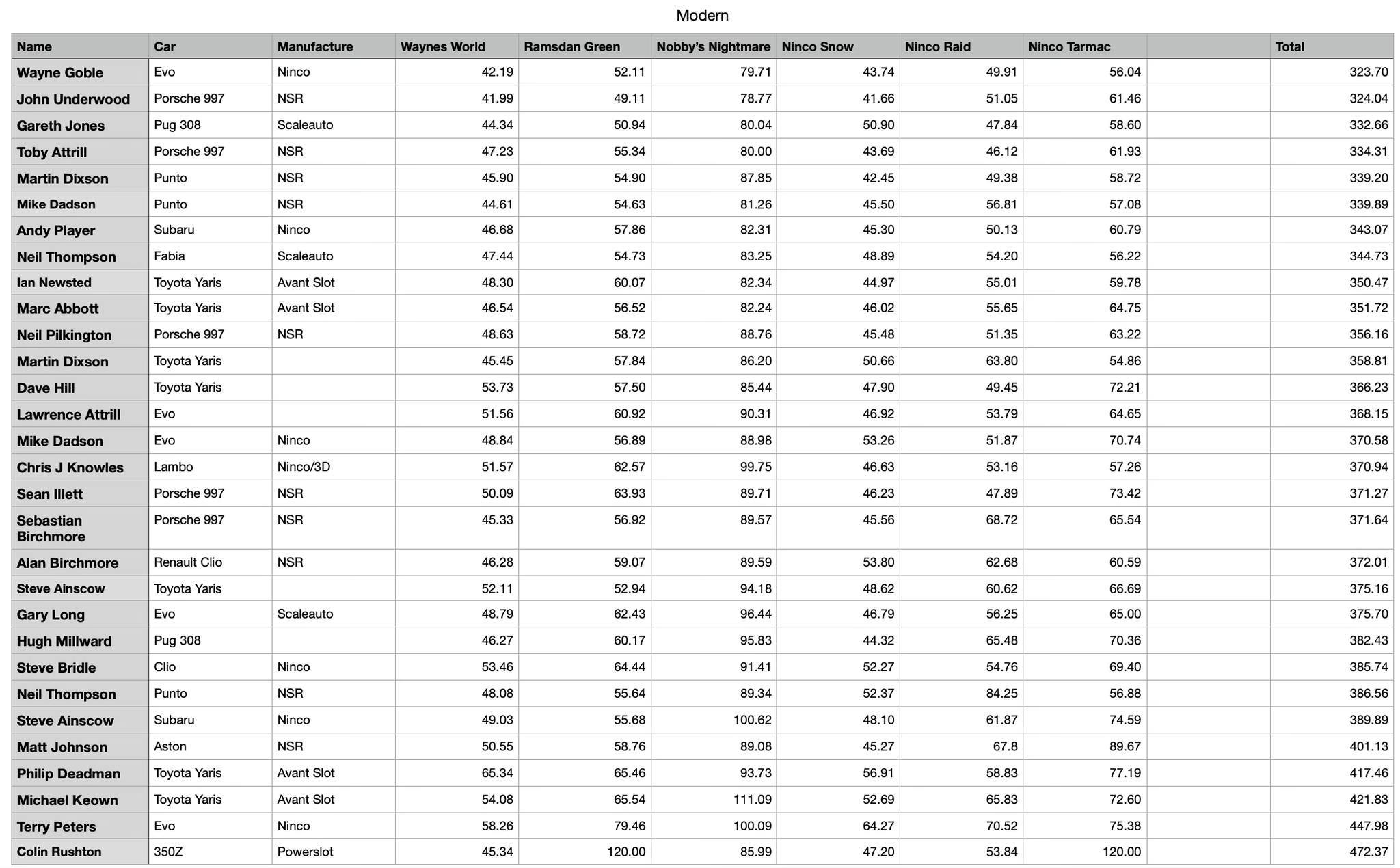 BMW: Mini Cooper. Citroen: C2, C3, C4, DS3, Xsara. Fiat: Punto. Ford: Focus, Fiesta, Puma. Hyundai: Accent, i20. Mitsubishi: Lancer Evo. Nissan: 350Z. Peugeot: 207, 208, 307. Porsche 997. Proton: Iriz. Renault: Clio Mk2 onwards, Megane Mk2 onwards. Skoda: Fabia. Subaru: Impreza Mk2 onwards. Suzuki: Swift. Toyota: Yaris. Volkswagen: Polo.