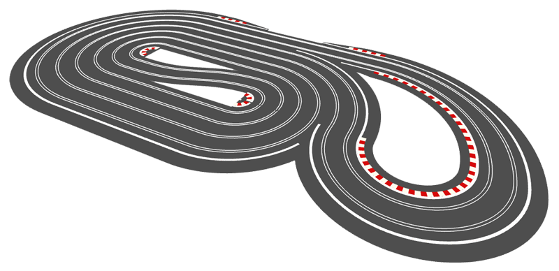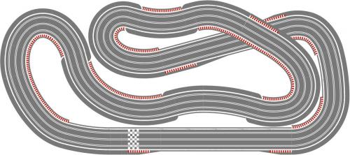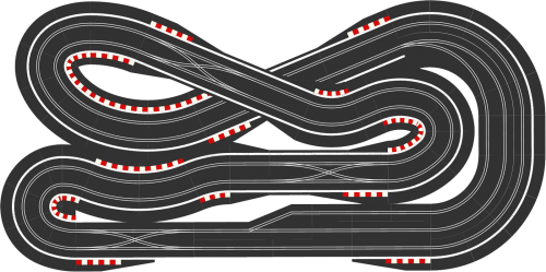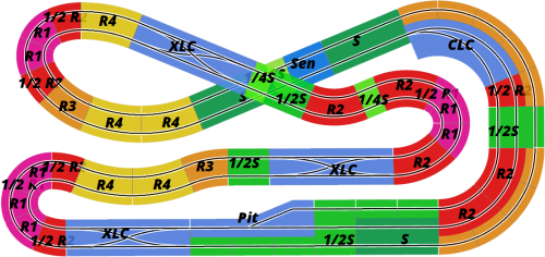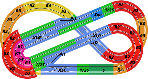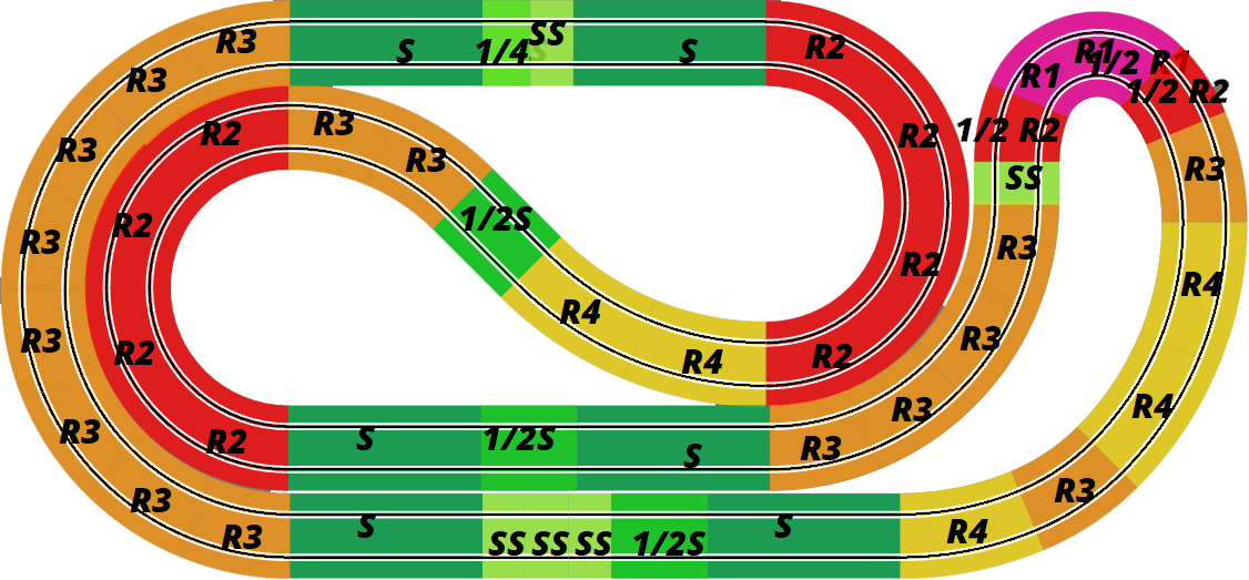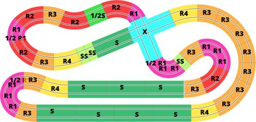 But looking at the tracks above, I just wonder whether something like SCX-5015 or SCX-5112 might make a better test track? They might not be as visually appealing, but they have a much more even balance of corners. You could replace the flat R3s on the left with banked R3s, which would give you a nice high speed section round the outside, and you could replace a couple of the R2s with an R2 crossover curve, so that you drive both lanes, and therefore test your cars on every radius of corner that Scalextric have to offer. Just a thought.