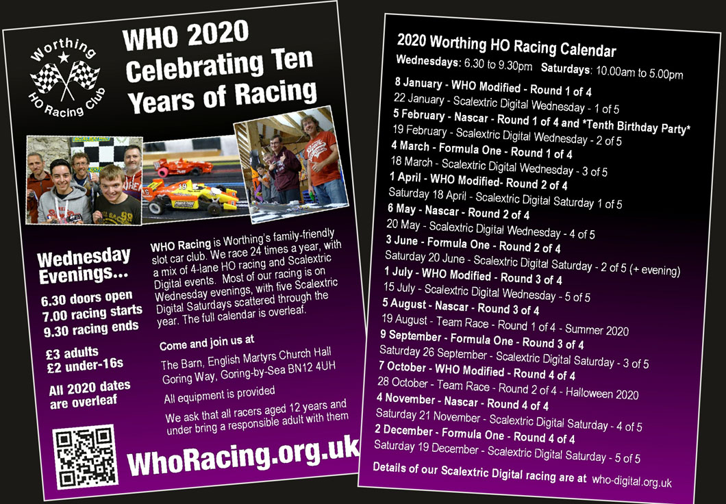 Club cars and controllers are always available for our Wednesday evening events at no extra cost. If you are planning on running your own cars, the HO rules are here, and the 2019 WHO/digital guide is available here.