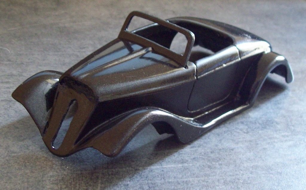 I've done a little more to the roadster. Screen from double layer of plasticard. Hopefully, I have left enough of a rebate to get the glazing in. Headlights to make and then, when the paint is properly hard, mask it up and spray the body below the trim line in red.
