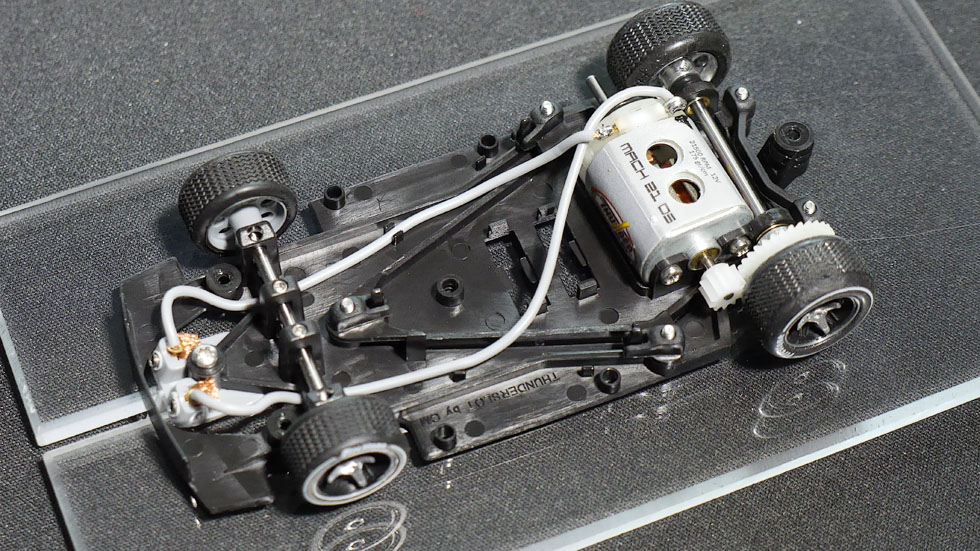 Three things that do stand out include the rather 'different' guide which is sculpted in a 'swoop' to maximise depth and stability but minimise friction in the slot. The second thing is that there is no magnet fitted as standard. There are pockets for a bar magnet if you absolutey have to use one, but it's a nice statement from the Thunderslot team that these cars should be run without extra downforce. The final difference is the plastic pinion and spur gear - something I prefer with 'normal' motors, giving better mesh out of the box.