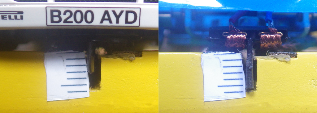 This car comes with a fairly hefty guide blade to keep it in the slot - it is after all I believe aimed at beginners. You may want to trim this down or even swap out for a more regular size guide. Standard slat car guide on left compared with the one provided.