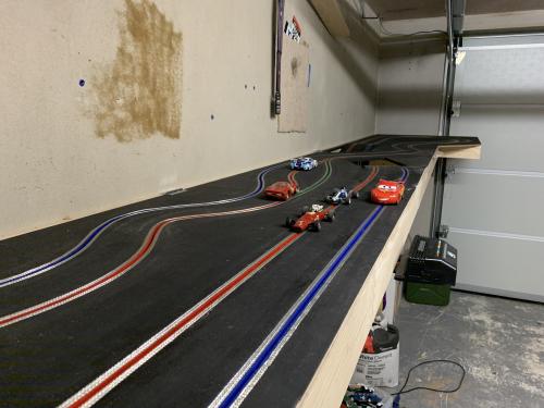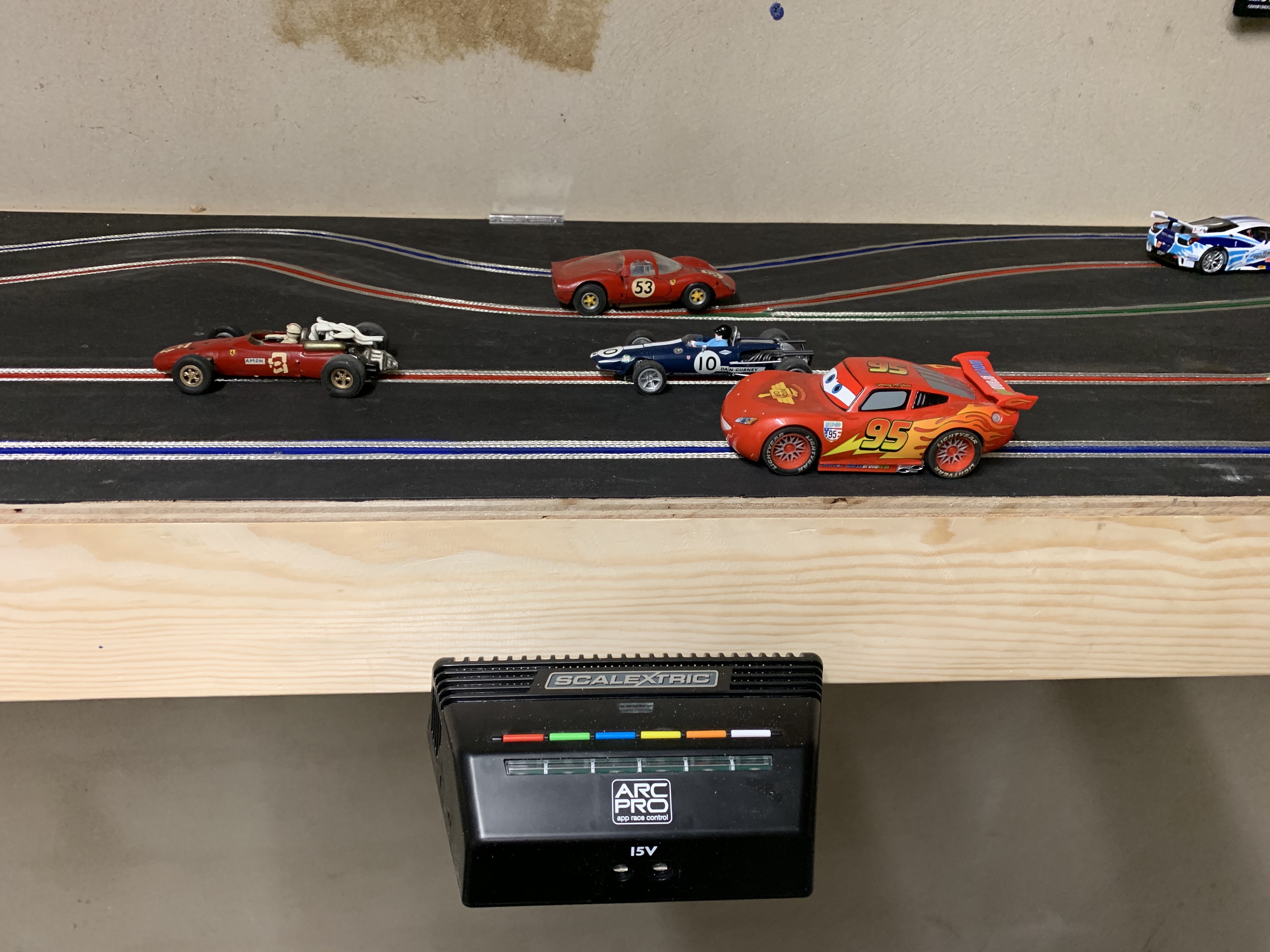 I've just built this track and connected it all using Scalextric Arc Pro, it's all coming together nicely and has been a few hours of work routing the slots, braiding, wiring etc. I used to have a wooden routed track back in the early 1990s as a teenager and I thought I'd do a modern version with all the tools and digital stuff which was either not around in the 90s or just too expensive. Many of the cars are 1960s vintage that are my father's from his childhood, they might not be the fastest but they just run better than modern cars on wooden tracks.