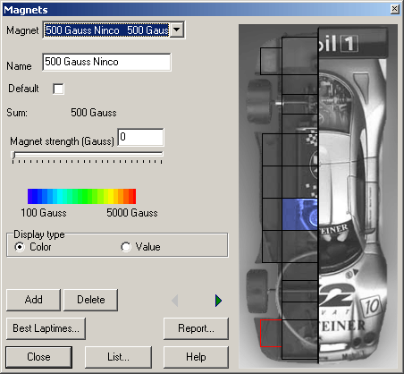 Magnets are added by clicking the corresponding part of the chassis displayed on the right of the dialog and by setting it´s value using the text field or slider control. This way the position and strength of the magnet is configured.
