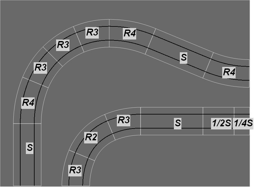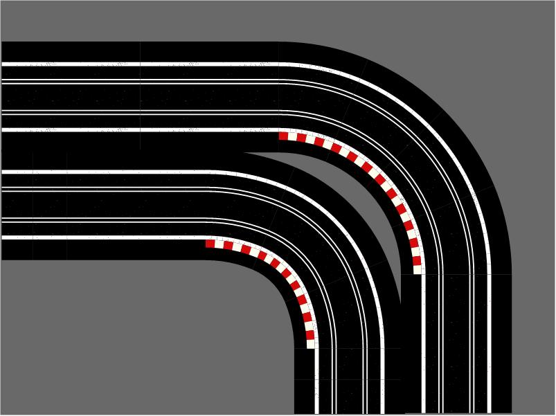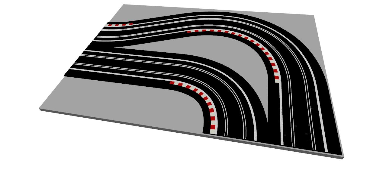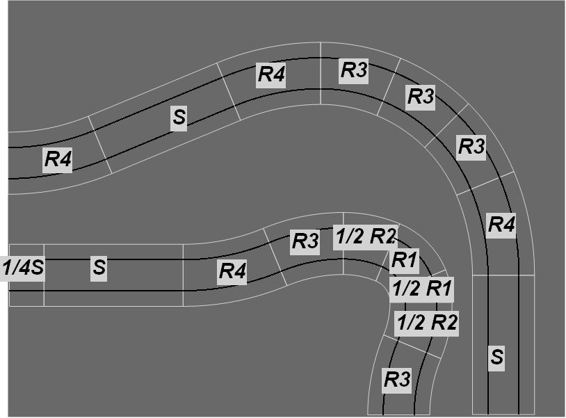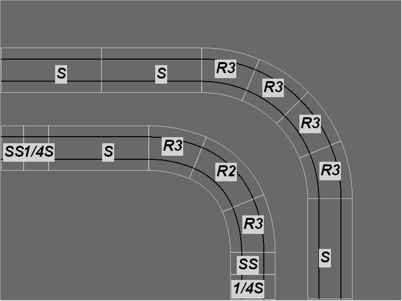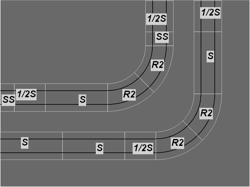 R1 Corners have two R1 track connection exit points on adjacent sides of each module, thus turning the track direction through 90°.