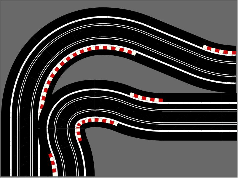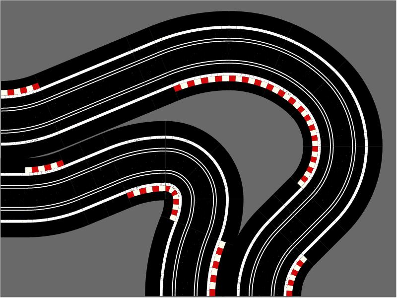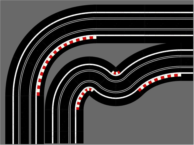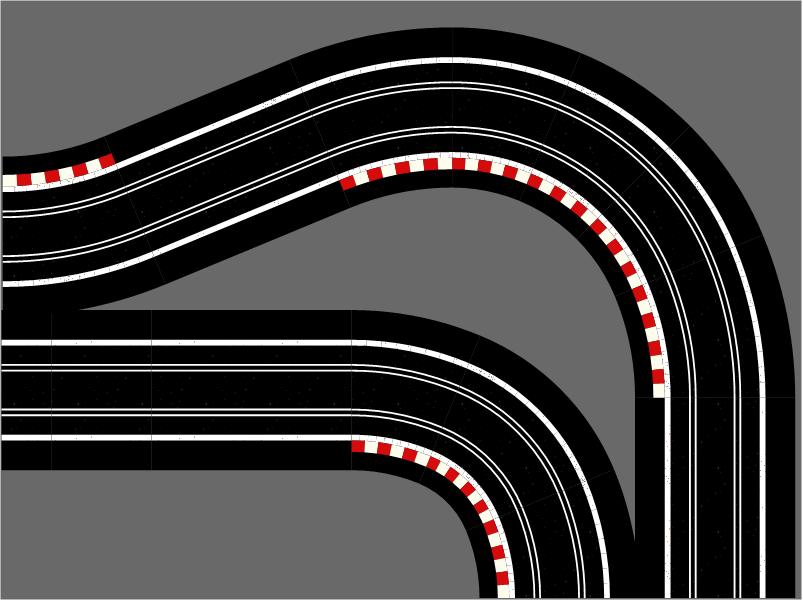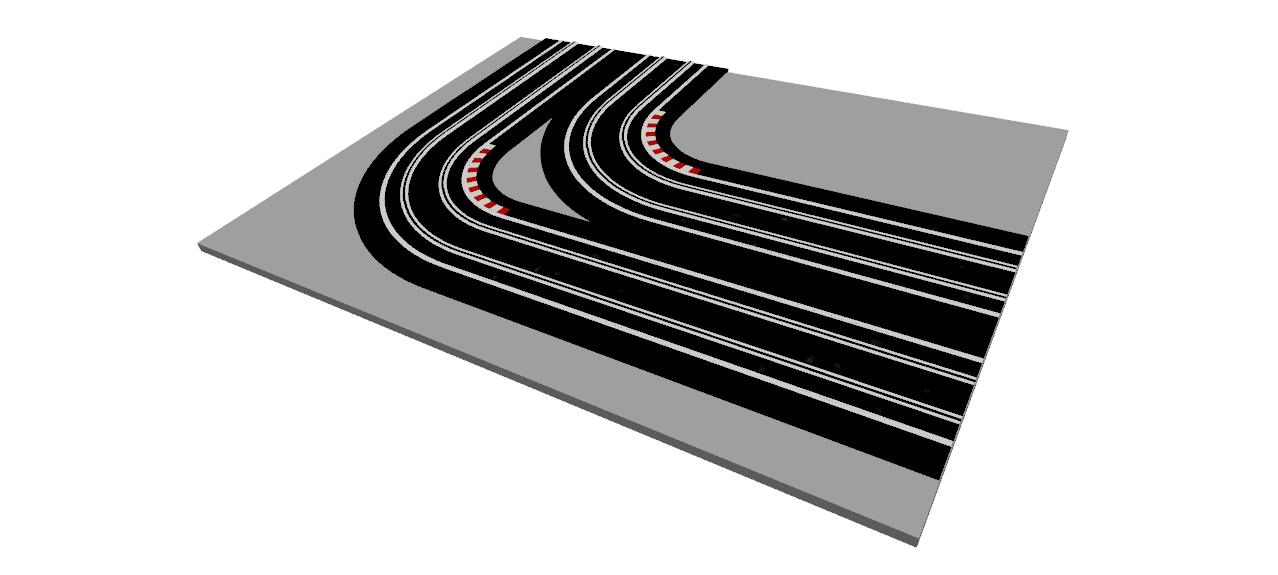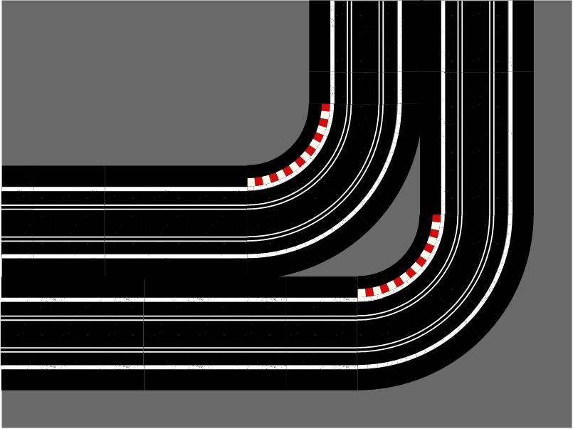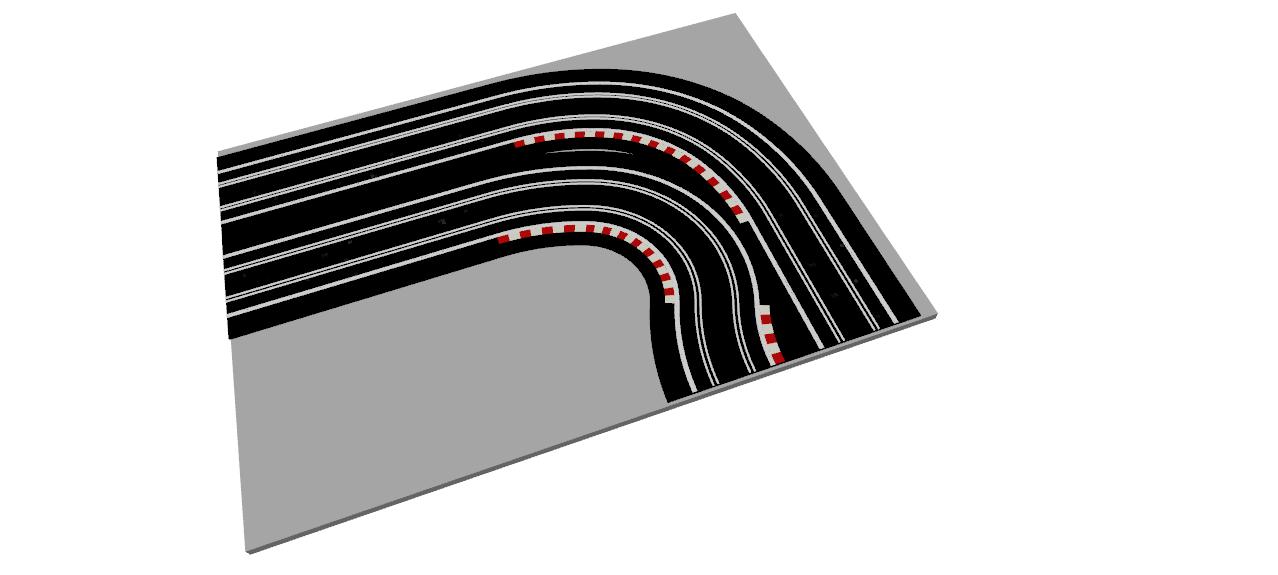 R1 Corners have two R1 track connection exit points on adjacent sides of each module, thus turning the track direction through 90°.