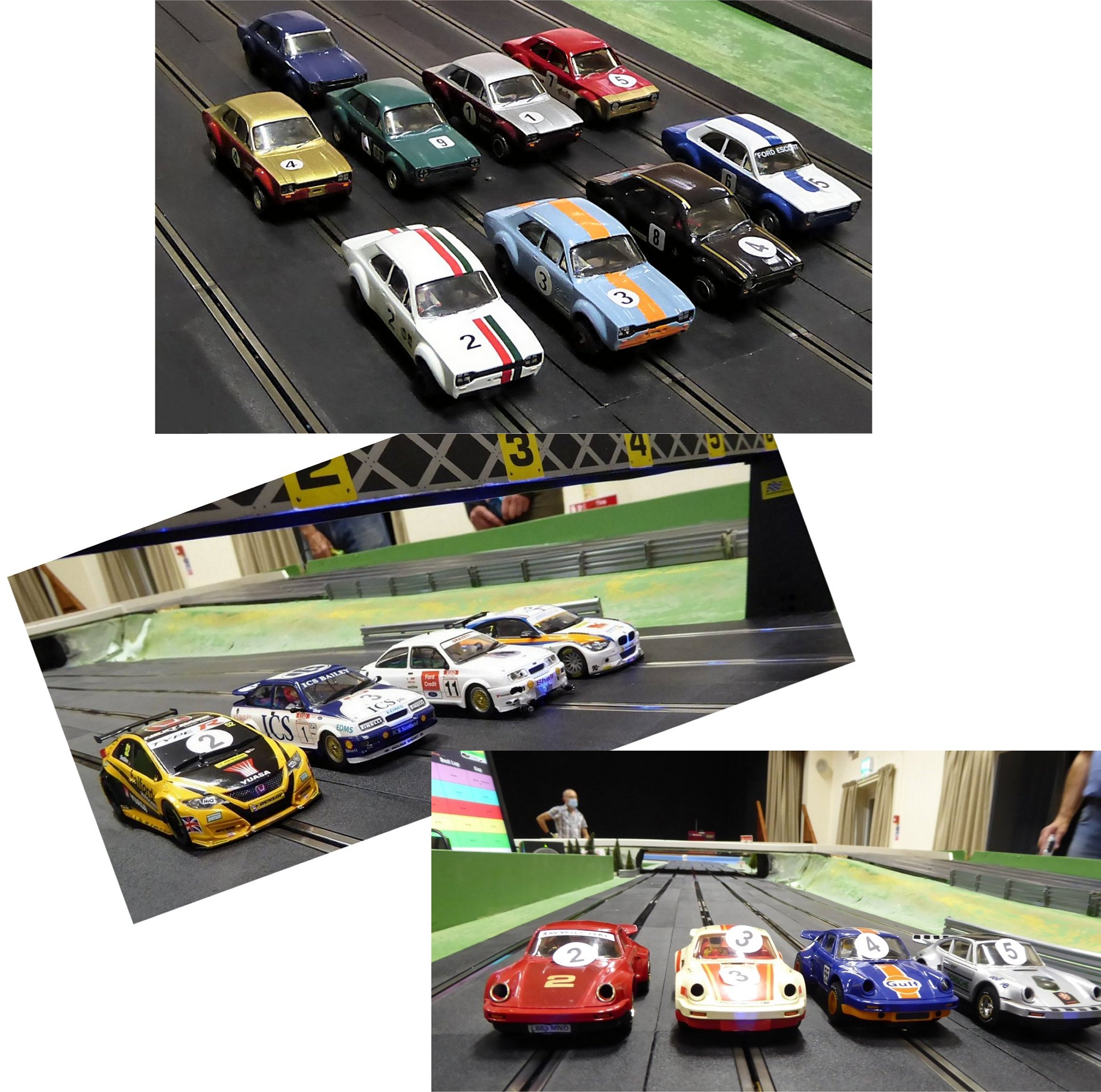 This was their first outing, the cars only being powered up directly from a PSU whilst being set up at home. Prep' was down to completely stripping all six - they were pre-owned and pre-built but unused white kits intended for another club's IROC racing, which fell through. The strip-down took the cars back to their kit form, including removing all heat welded body parts then carefully rebuilding them to factory spec'. The only changes from box stock were leaving out the magnets and the gluing and truing of all the wheels and (stock) tyres.
