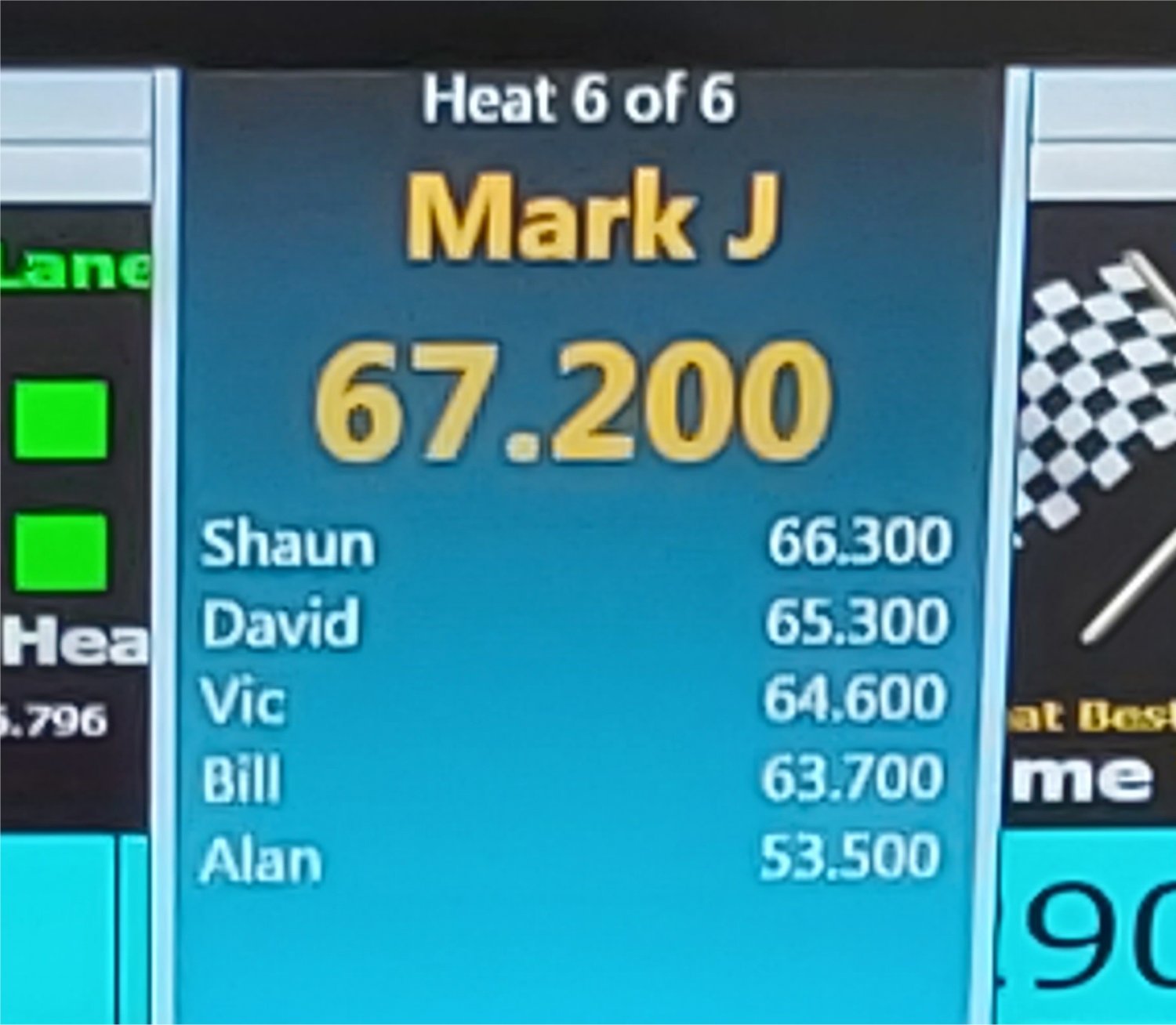This time Mark won the class from Shaun, followed by Bill, Vic, David and Max. However, Mark was unable to beat Shaun's 64.6 lap total from the Oct 2nd meeting, topping out with a 63.3.
