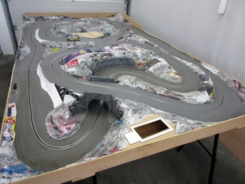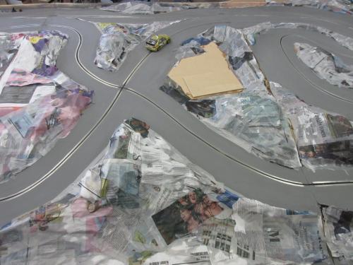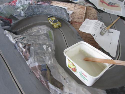 Work then began on the landscaping by covering the areas along the track with strips of cardboard and chicken wire.