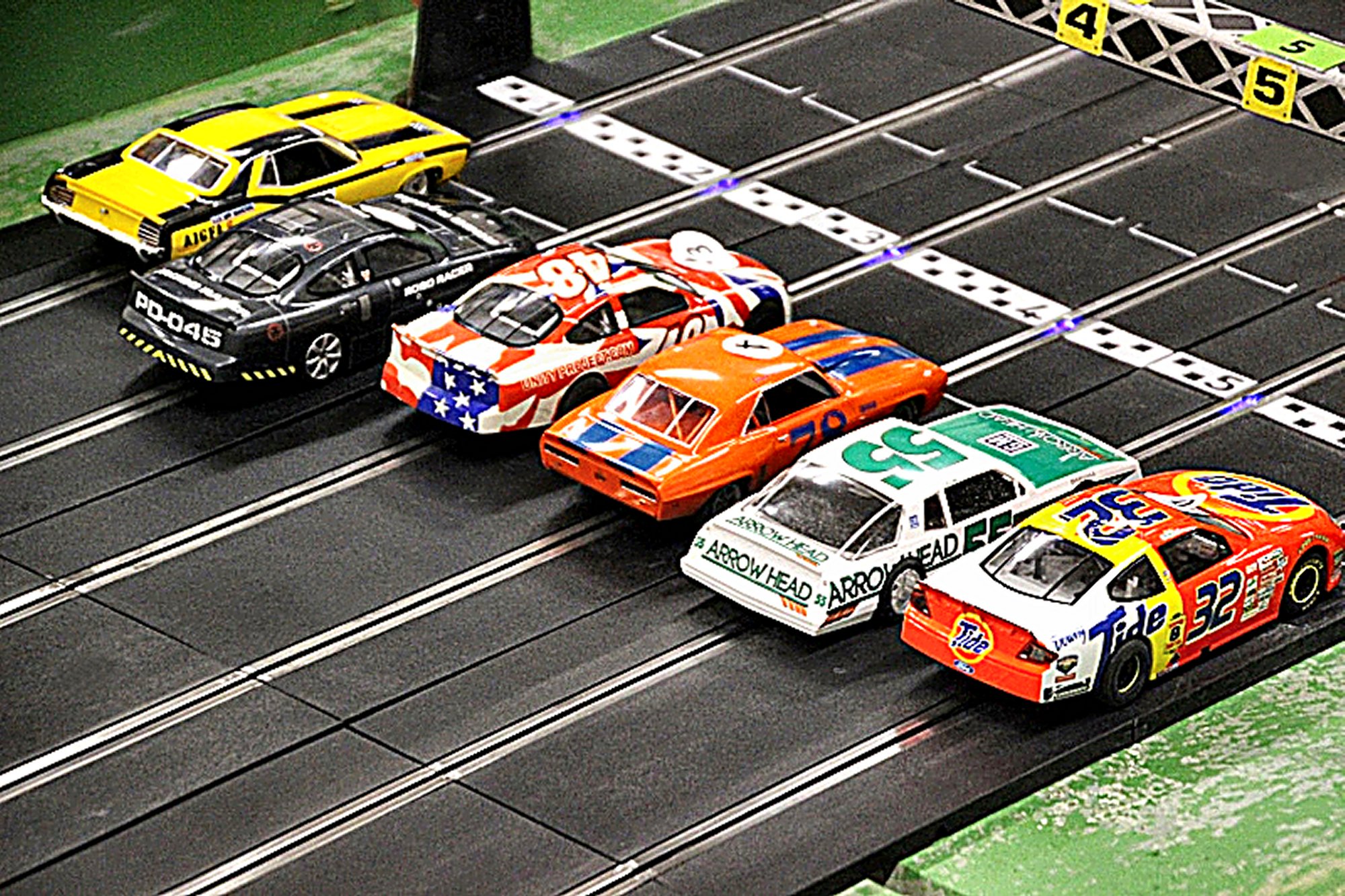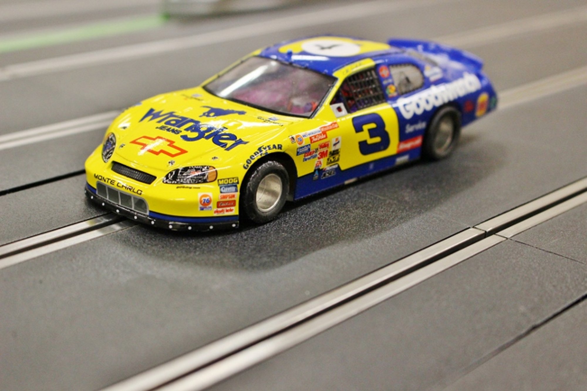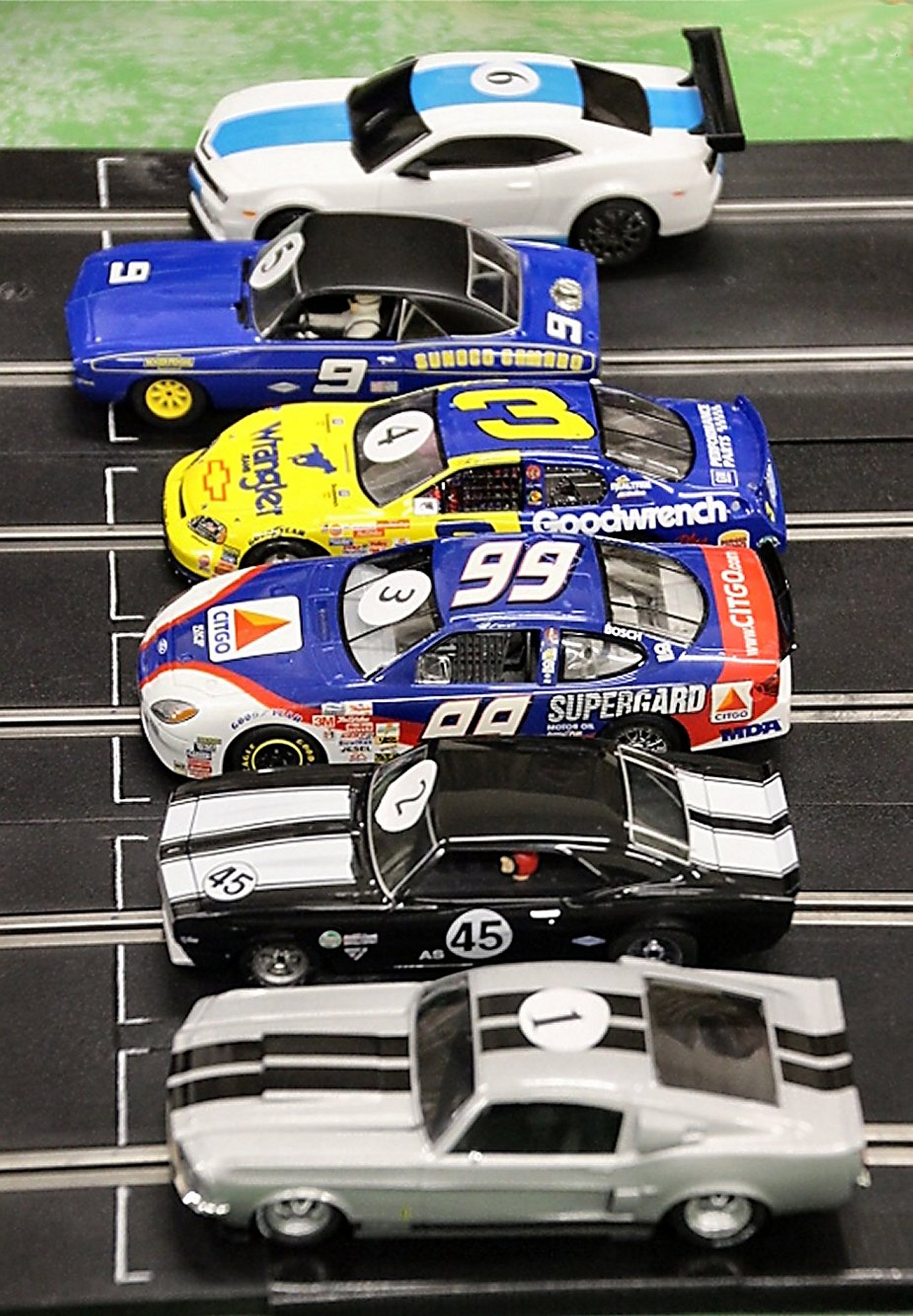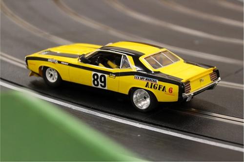 Back to more familiar (analogue) ground for this meeting luckily, as a couple of potential new members turned up to race the club (Shaun) provided Minis and owner/driver Nascar and American Muscle cars. Stewart and Larry made it up to fifteen attendees for the night. With the long track set up, voltage on 11.5 and practise over, the racing began.