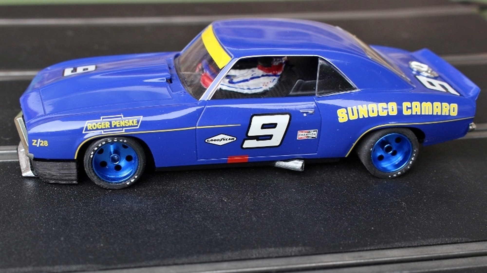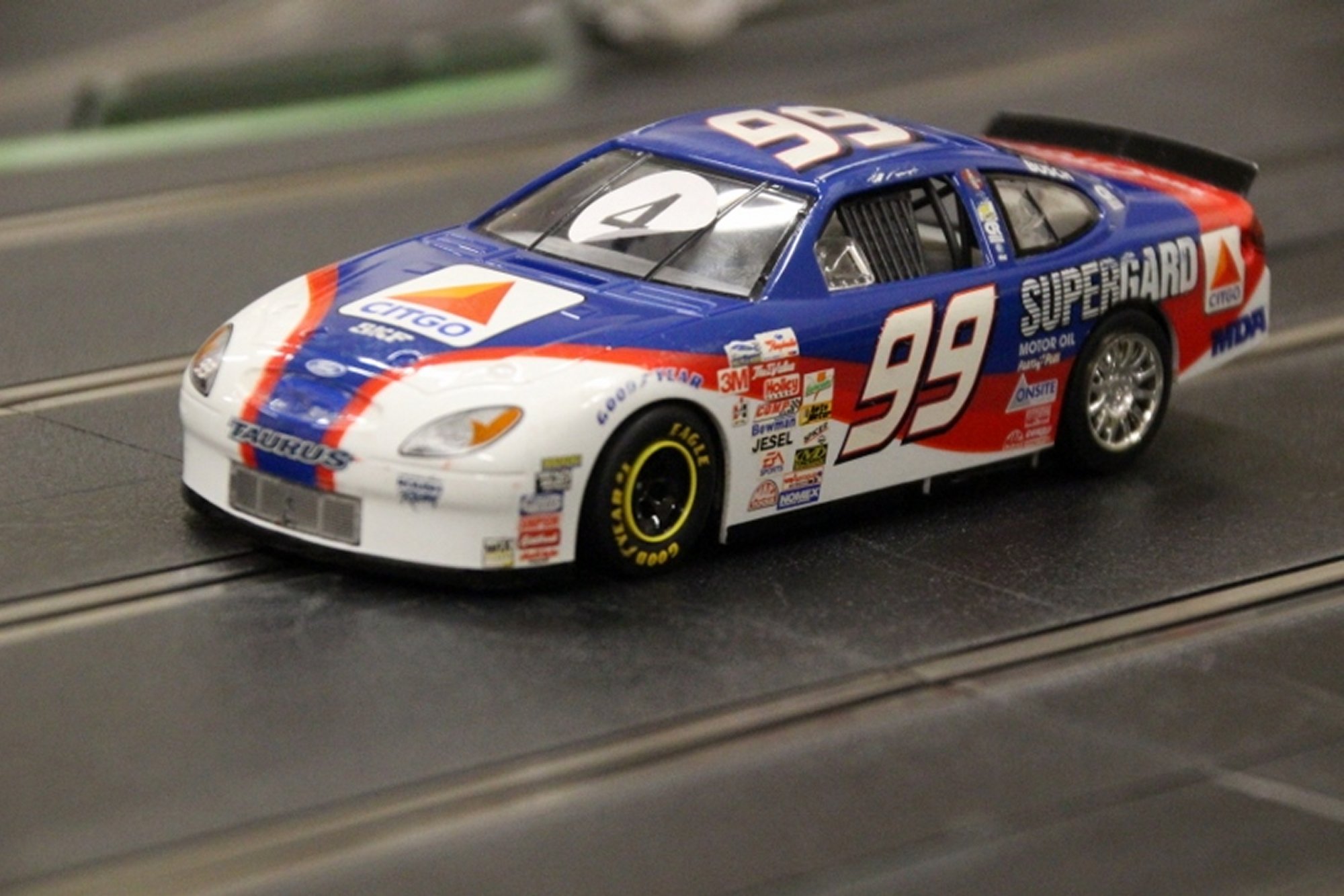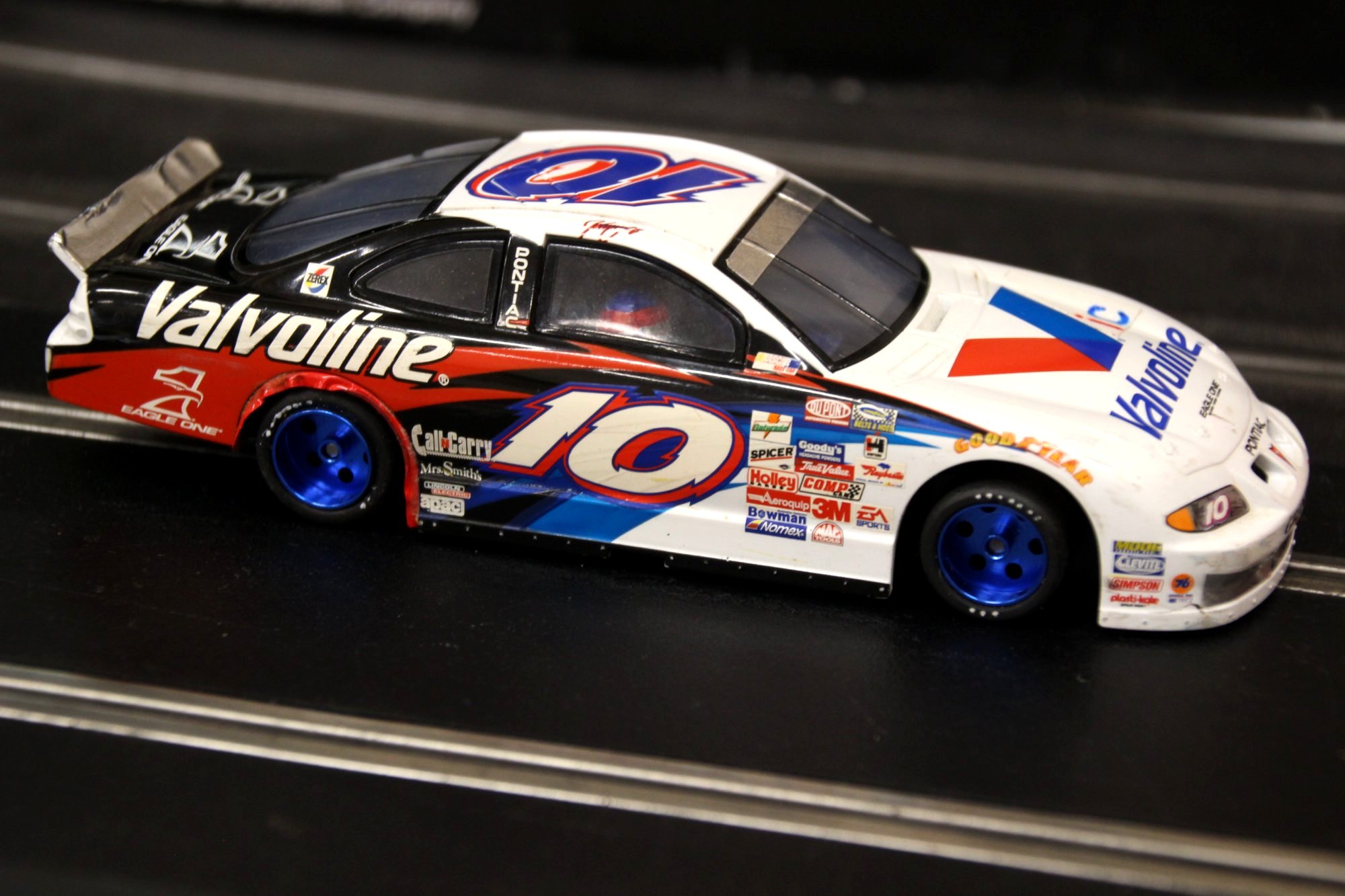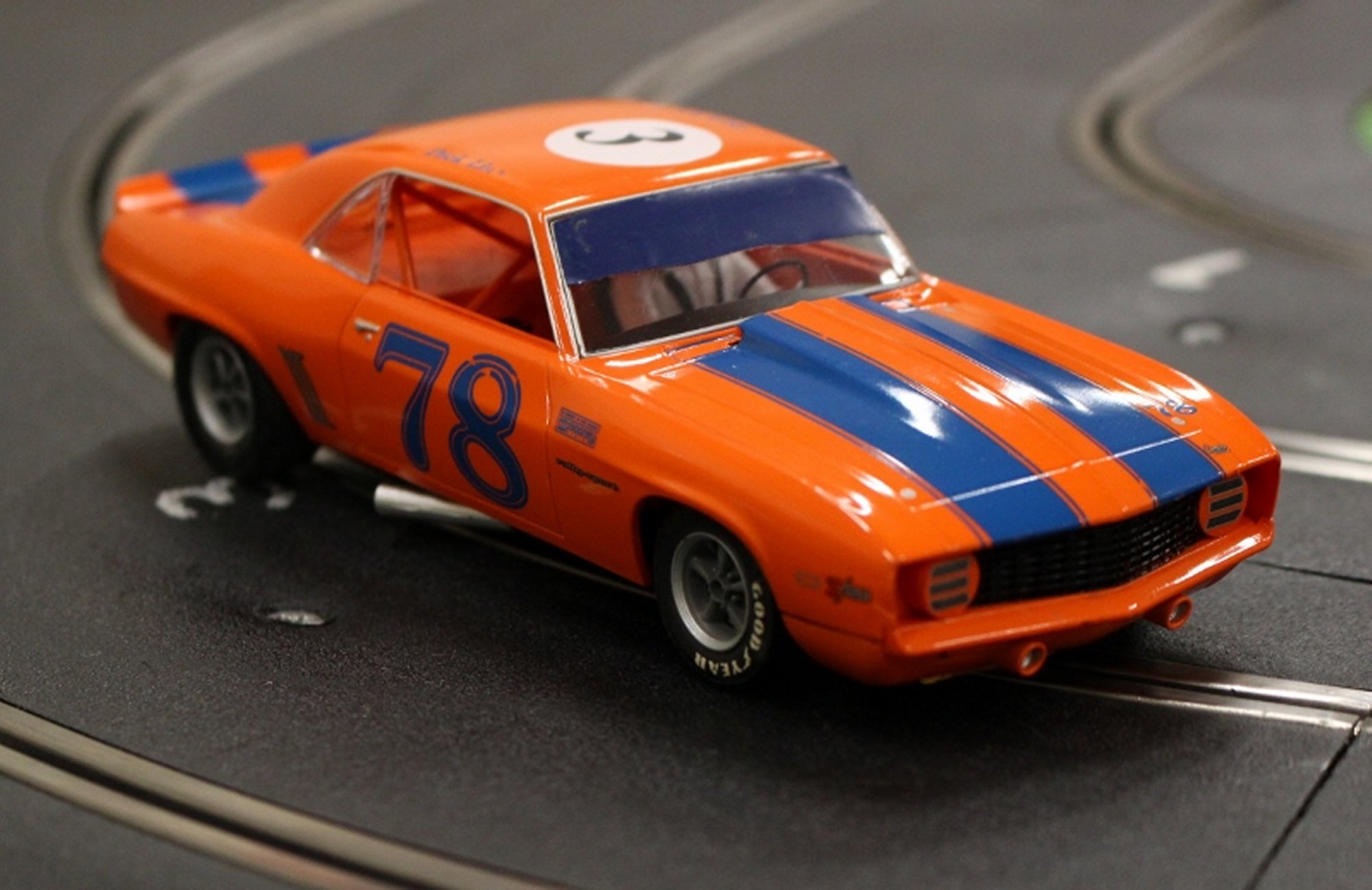 Back to more familiar (analogue) ground for this meeting luckily, as a couple of potential new members turned up to race the club (Shaun) provided Minis and owner/driver Nascar and American Muscle cars. Stewart and Larry made it up to fifteen attendees for the night. With the long track set up, voltage on 11.5 and practise over, the racing began.