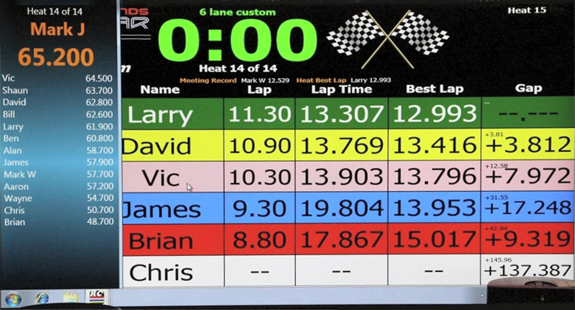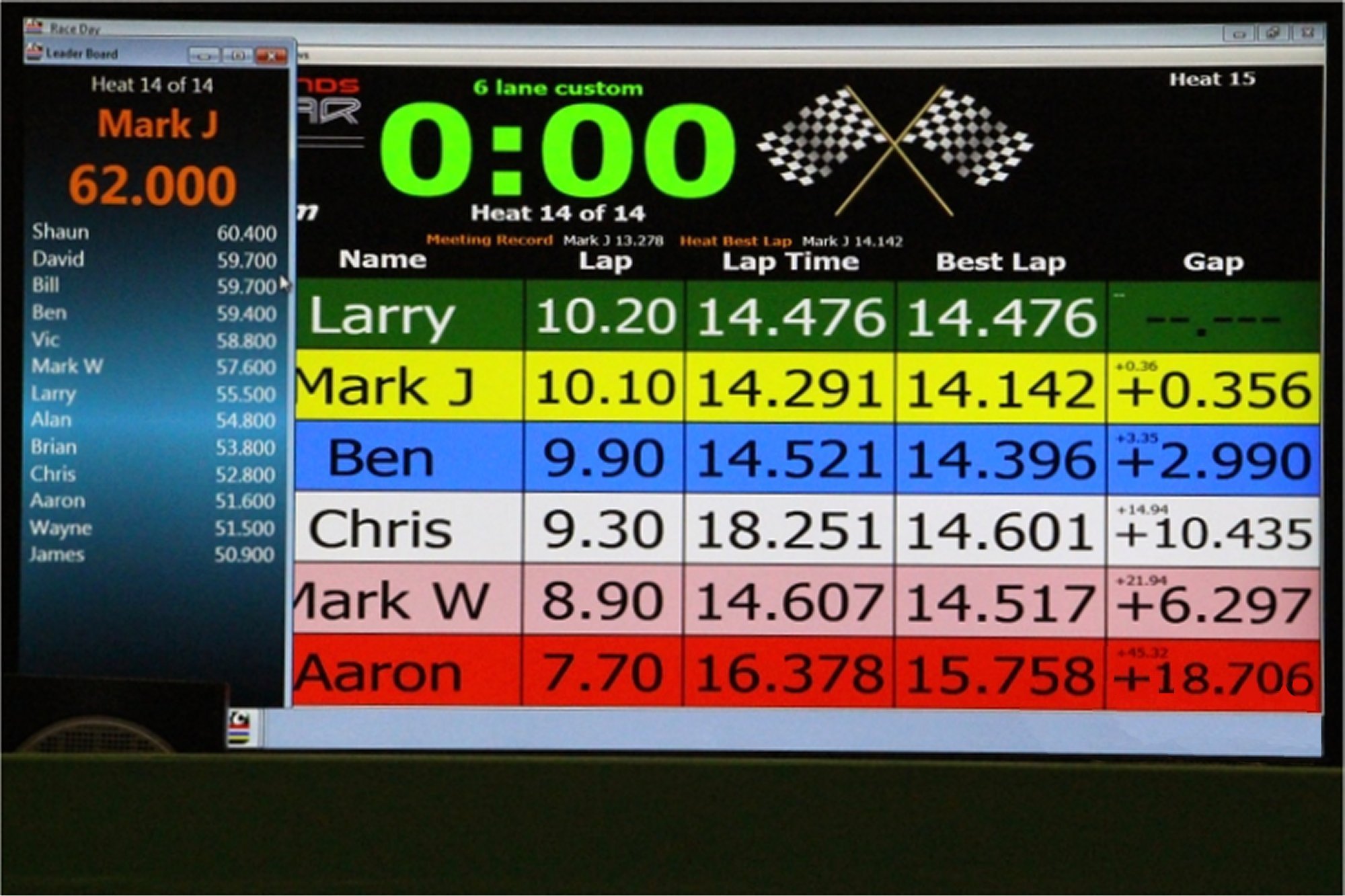 The final heat screen (shown below), which also gives overall positions, shows how closely matched the cars were, with five of the six drivers best lap times being covered by half second.