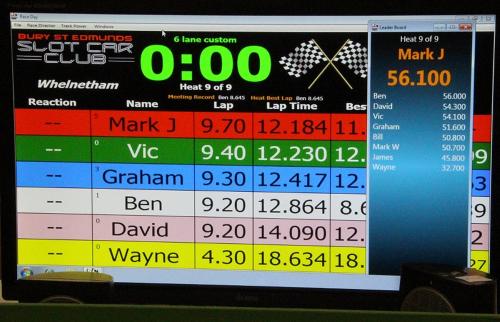 With the evenly matched cars, close racing was the order of the day. The more experienced driver, David, came home in first place - but only by two thirds of a lap ahead of the rest of the field. The next six places were covered by less than a lap, with Shaun second and Vic third. Mark J, Ben, Graham and Bill took the next four spots. There was then a bit of a gap back to Mark W. who plugged the gap less than a lap behind in eighth. The remaining trio of Alan, Wayne and James were three laps down but enjoyed a great battle, the three being covered just two fifths of a lap.