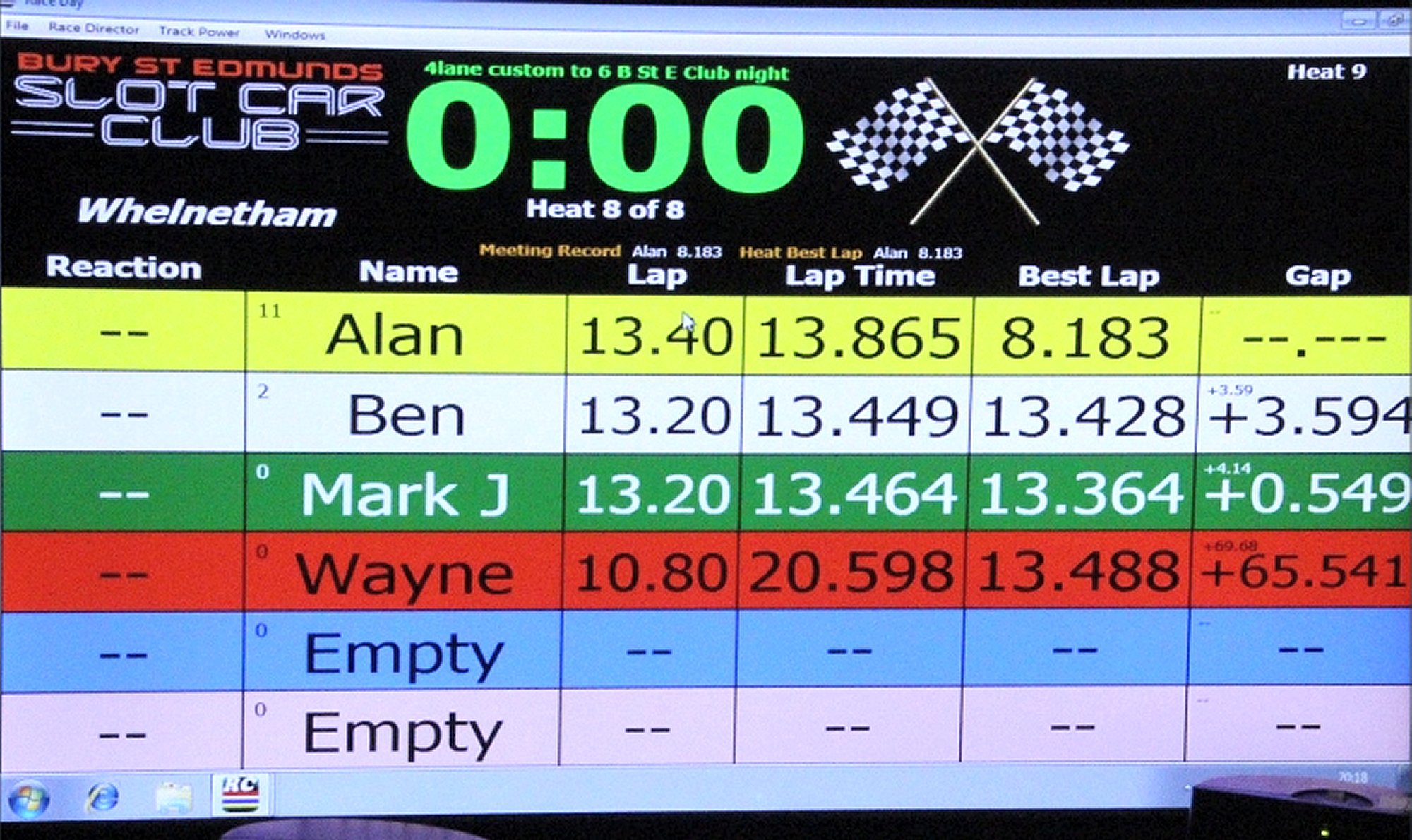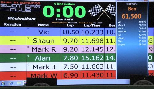 With equal cars it was down to the car set up and smooth driving from the eight drivers. Close racing ensued with many side by side battles, Vic eventually coming home in first place just seven feet ahead of Bill. The screen shot from the last heat shows how close the racing was, Alan taking the win by a fifth of a lap from Ben, with Mark J just over a half a second behind in third spot.