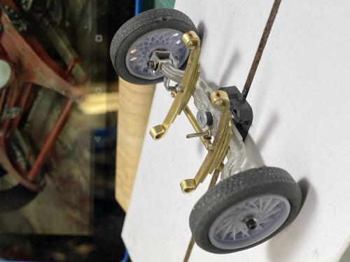 The guide bit I have copied George Turners idea of what he has on his Edwardian cars, I soldered a brass tube to a flat piece of brass that sits on the guide and soldered a 1mm piece of piano wire to it to attached to the steering rod.
