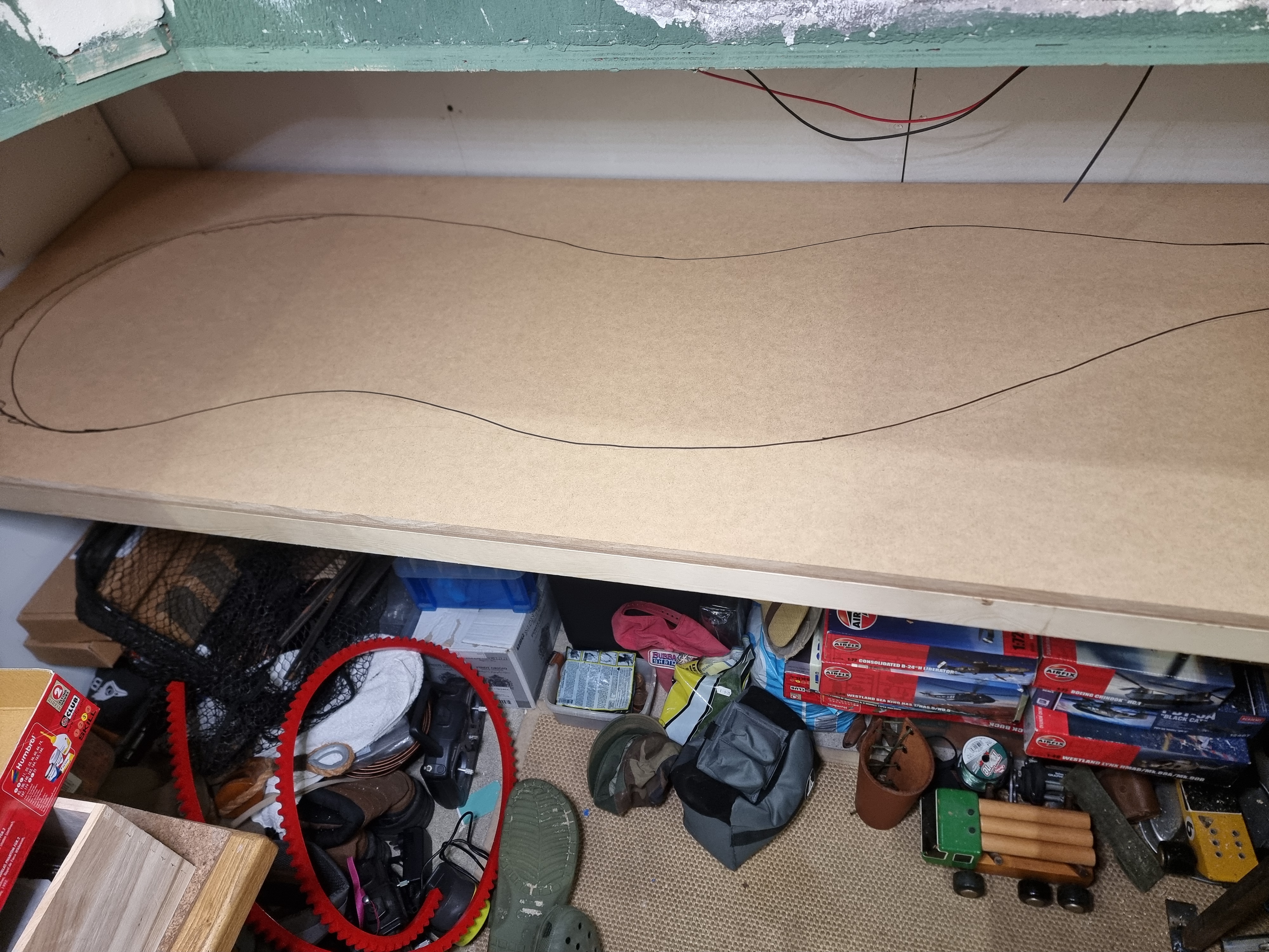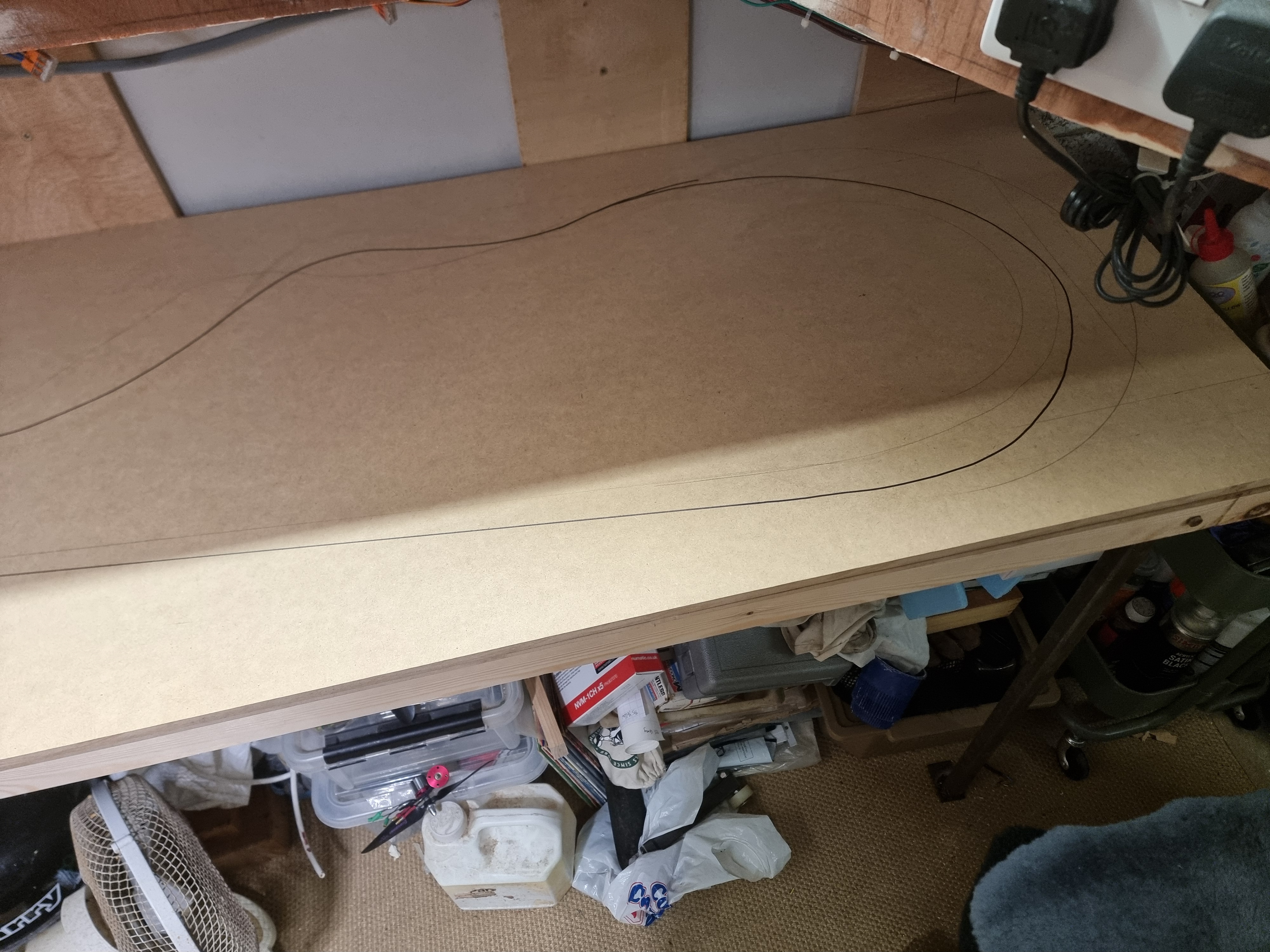 I've had a preliminary draw using compasses rulers gauges etc. but resorted to freehand  I have drawn the slot the road will be drawn when that's routed then I'll cut it out so the back can be elevated. There will probably be a few tweaks  but im pretty happy so far trying to keep it quick and flowing.