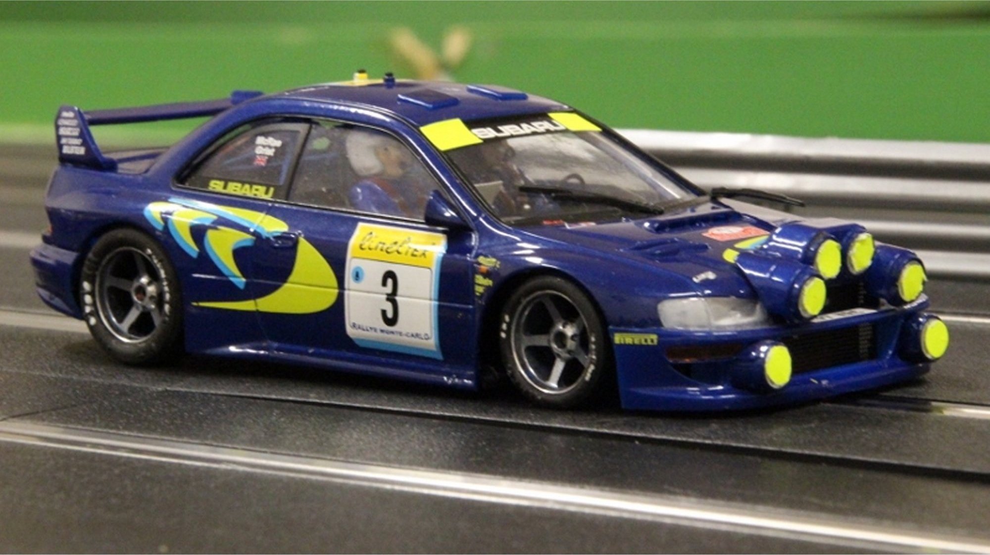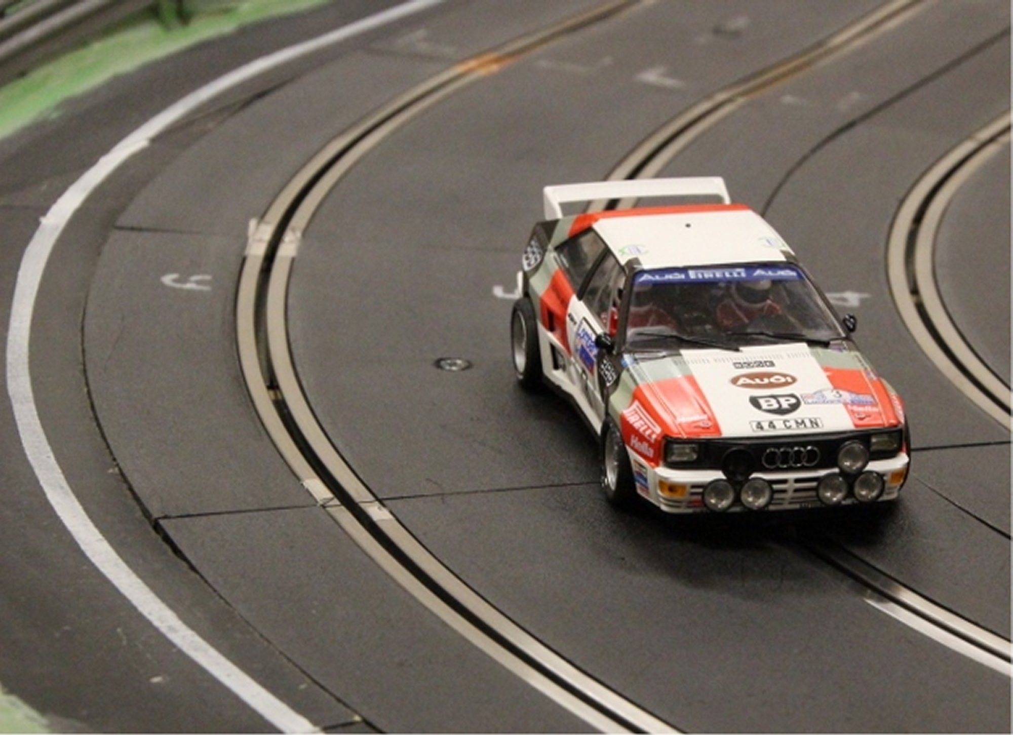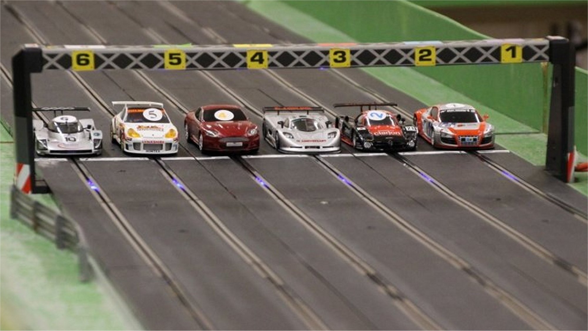 The colourful grid was made up from many 1:1 and 1:32 manufacturers with Ninco, Slot.it, NSR and modified Scalextric being represented.