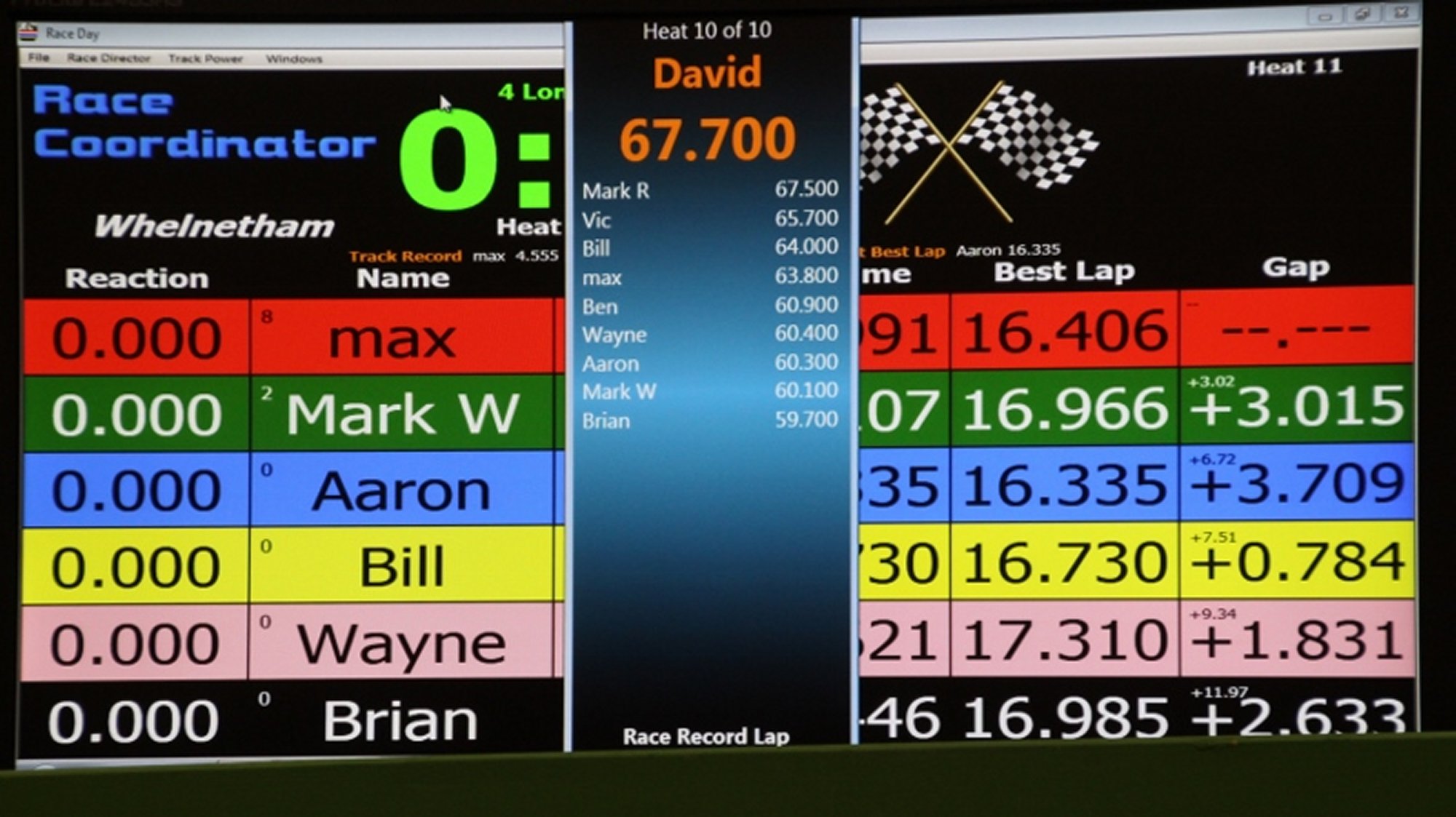 At the end of the session Race Coordinator showed just a third of a lap covering Alan and Brian tied for sixth and Wayne and Mark tied for seventh, ranking them on screen in order of their fastest laps.