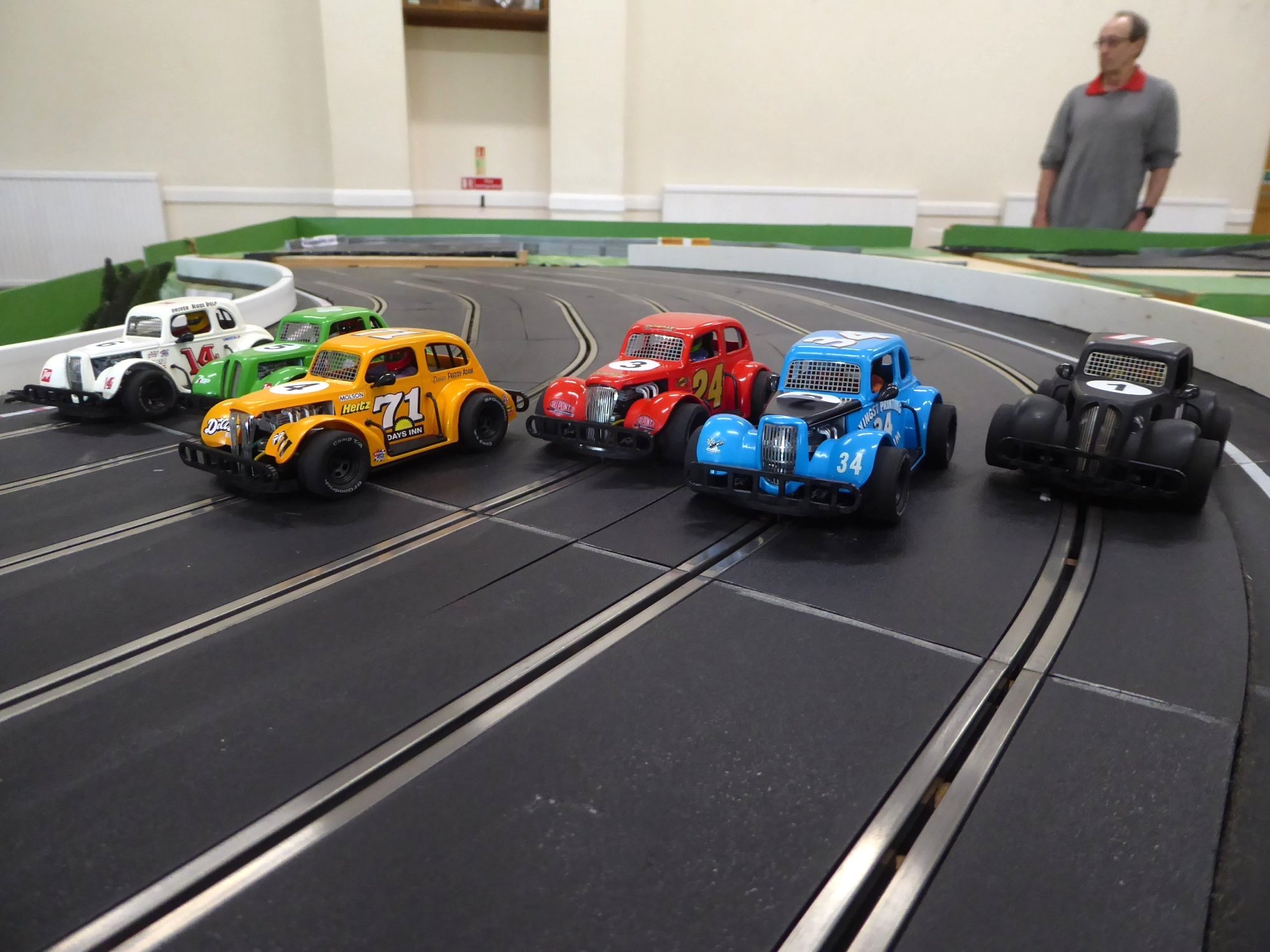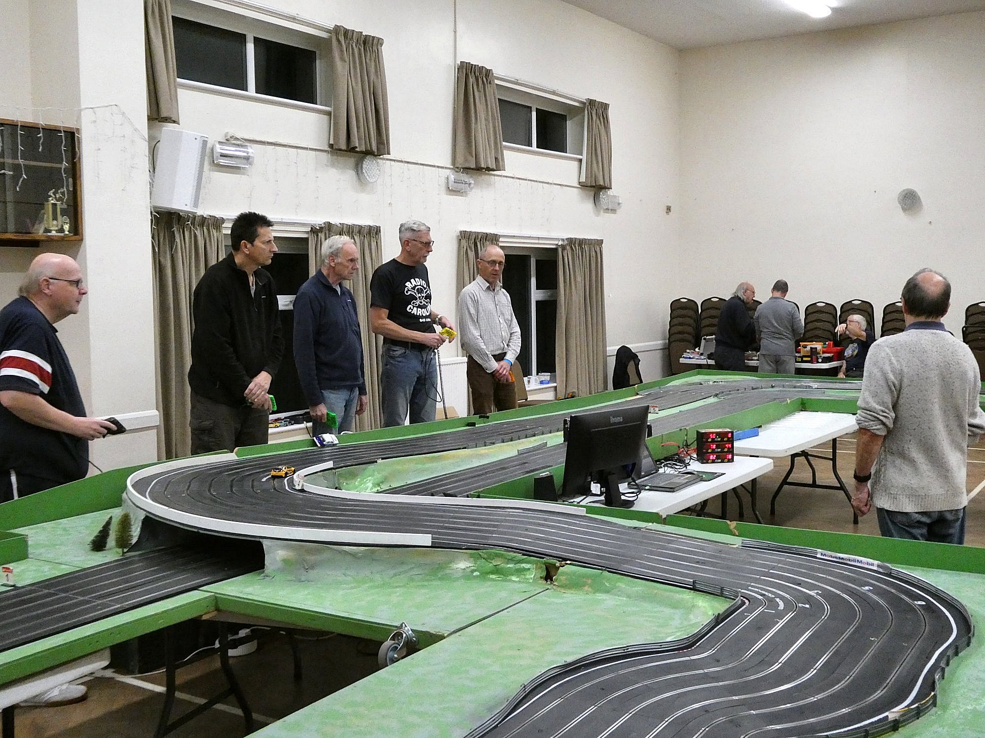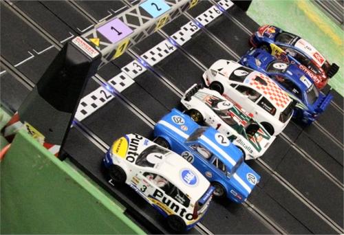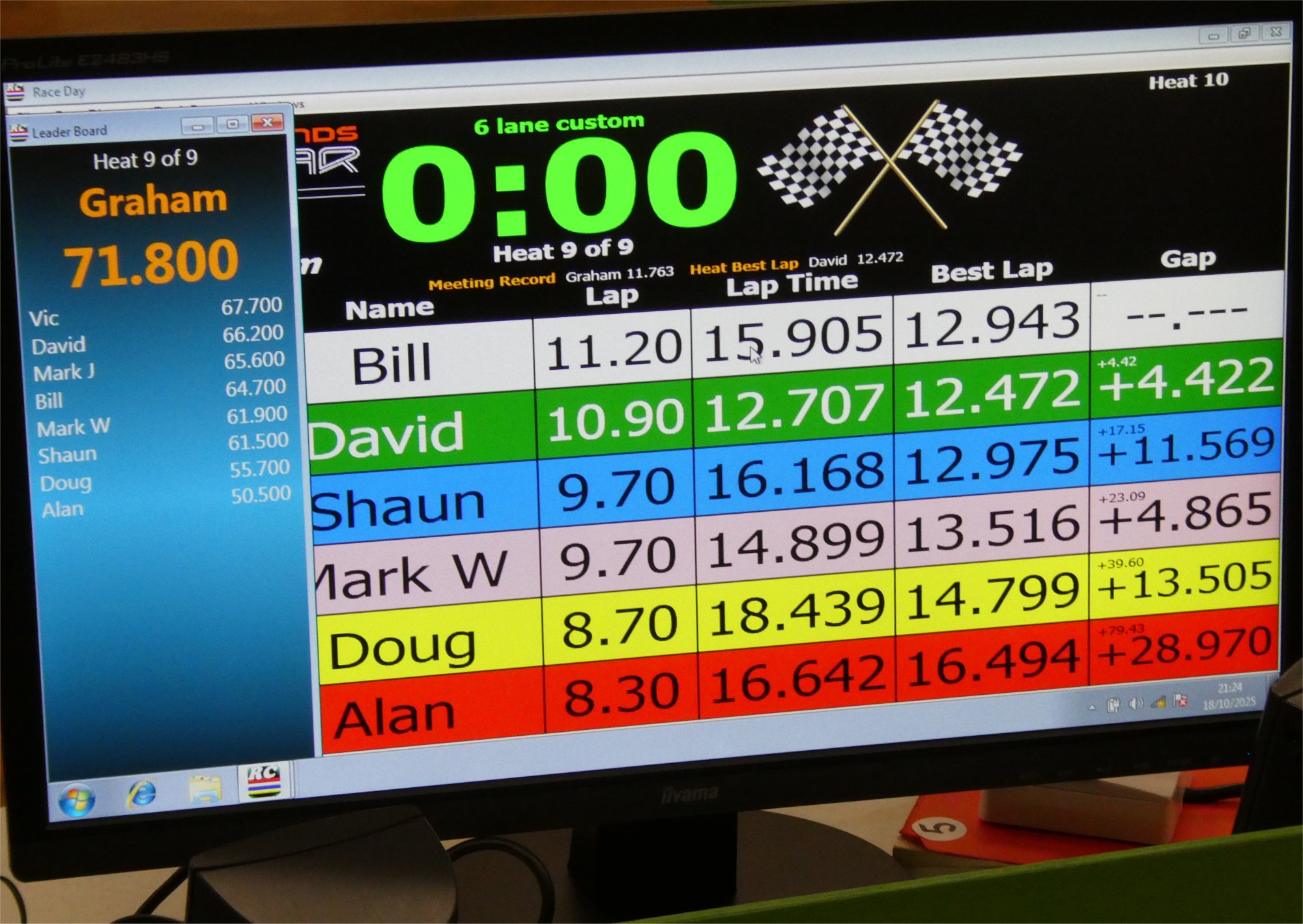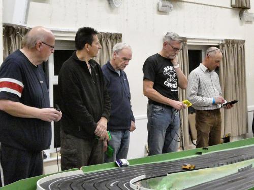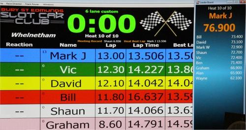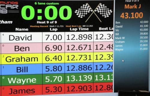 With equal cars it was down to the car set up and smooth driving from the eight drivers. Close racing ensued with many side by side battles, Vic eventually coming home in first place just seven feet ahead of Bill. The screen shot from the last heat shows how close the racing was, Alan taking the win by a fifth of a lap from Ben, with Mark J just over a half a second behind in third spot.