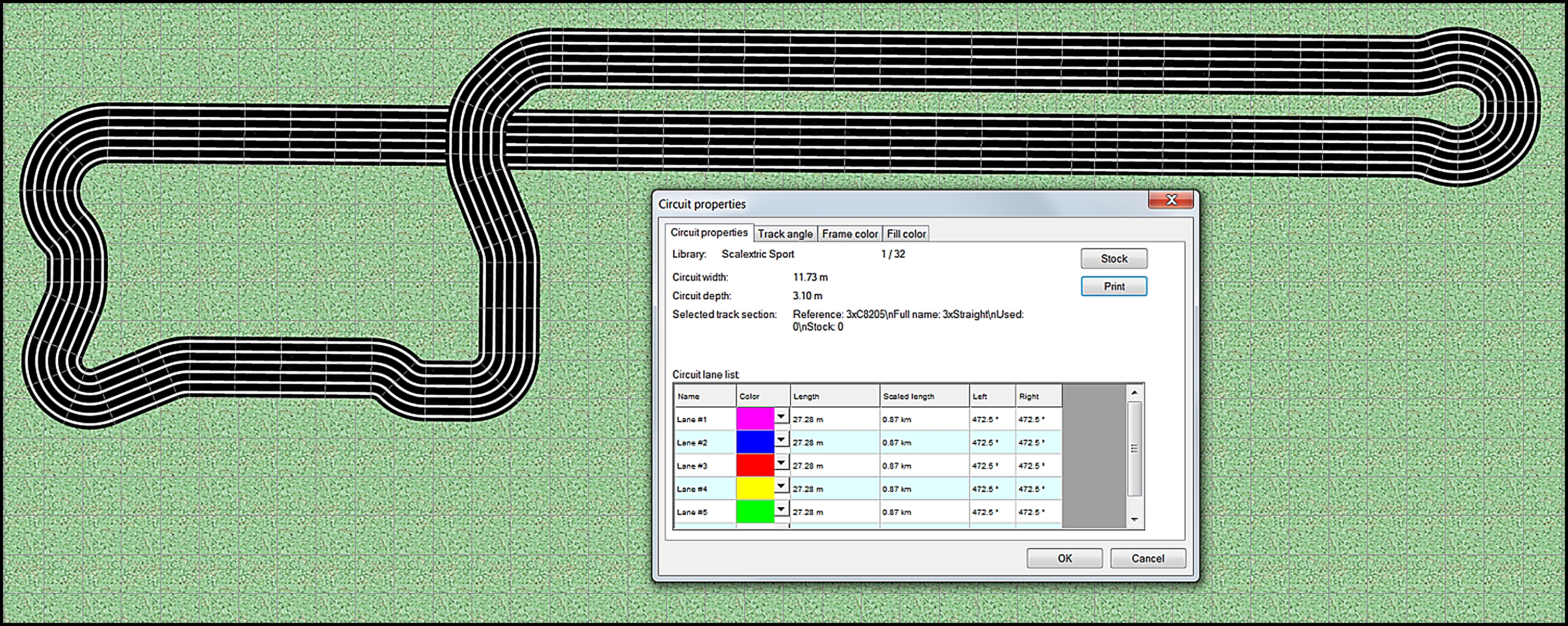 B St E's track - Version 2 - a straight run to Bentleys Hairpin. (27.28m - 89' 6" - equal lap length across all 6 lanes, with a 32' main straight.)
