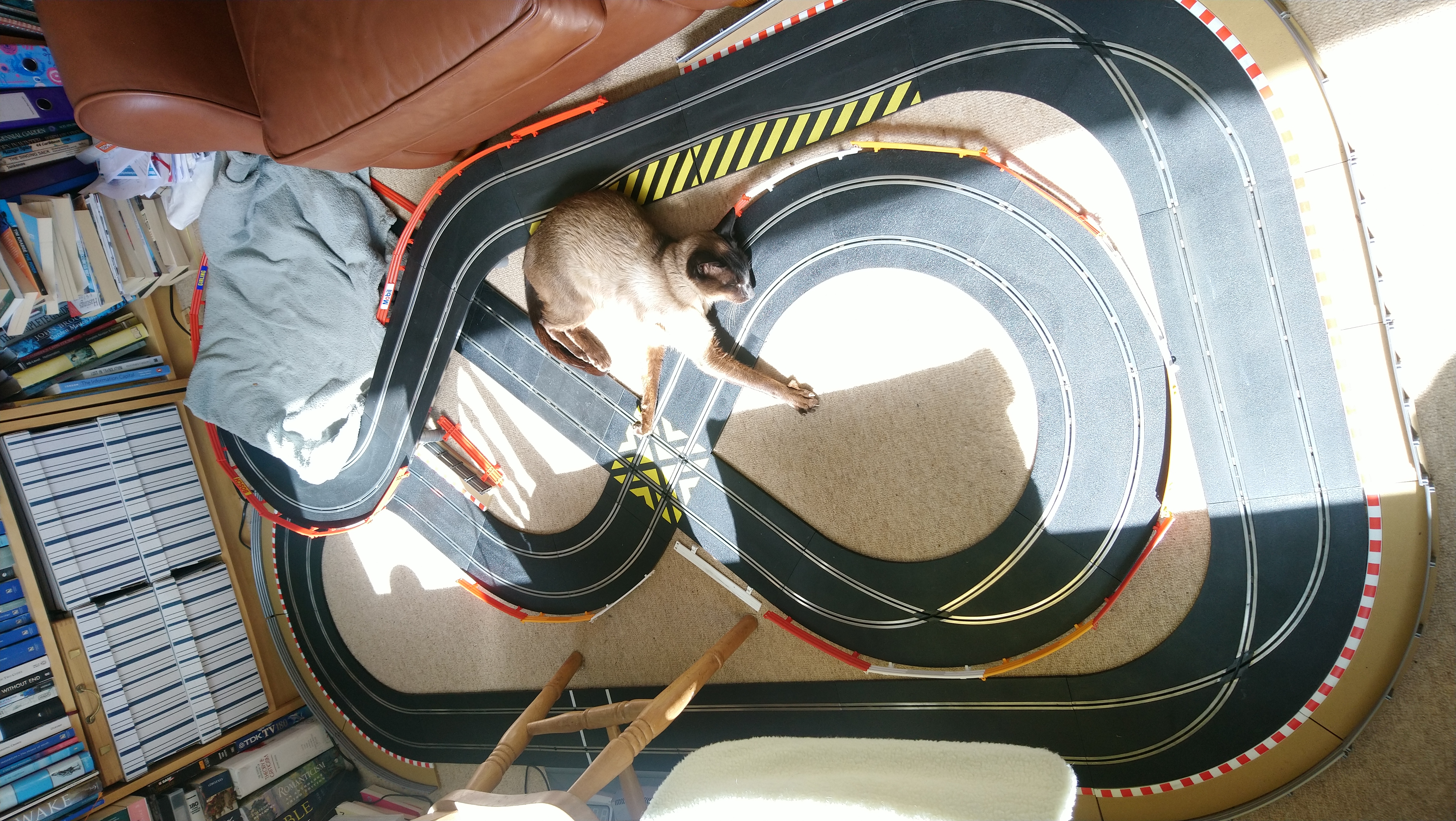 I've added a third crossover so a car goes round both lanes continuously, and there is a lap counter hidden under the chair. So the intention is to set a timer for, say, 5 minutes, and see how many laps I can do in that time. Fettle the car and repeat, fettle and repeat etc until I find the sweet spot.