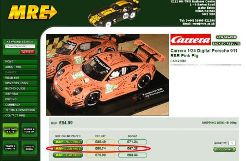 The example above shows the RRP and three price points for the 1/24 scale Carrera Pink Pig Porsche 911 RSR.