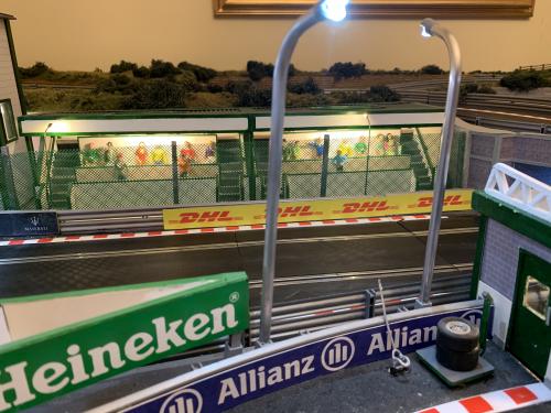 All the other structures are scratch built again all illuminated with interior detail etc. Various other figures and details from the likes of Slot Track Scenics have been added round the board. Details such as a small flock of sheep complete with Shepherd in a field adjacent to the track in one corner, and little things like the construction of actual 3d advertising signs (the Pirelli and Heineken signs next to the pit garage) hopefully bring things to 'life'.