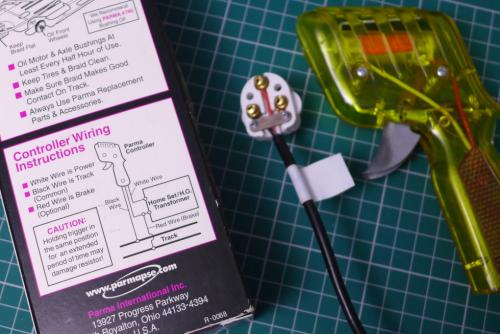 That’s about £8 for the controller box, plus a 2-amp roundplug (eg £1.87 from TLC) for each of your controllers and a few extra fuses to have handy. You’ll also need a soldering iron, flux, solder and a few other basic tools. I will mount the track piece and controller box on some foamboard – mdf or hardboard would do just as well to keep things neat and compact. The only loose cables are the ones to the power supply. You’ll should work out how long those wires need to be and adjust your speaker wire order accordingly. The cable I’ll make will be about 5 foot long to reach a power supply under the table.