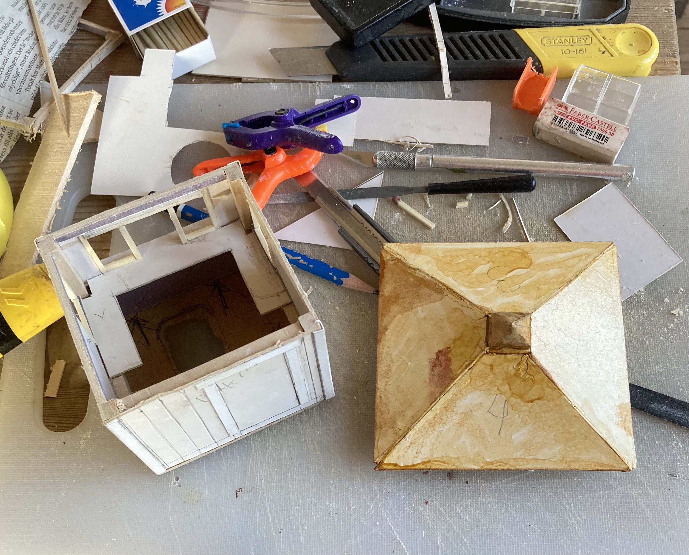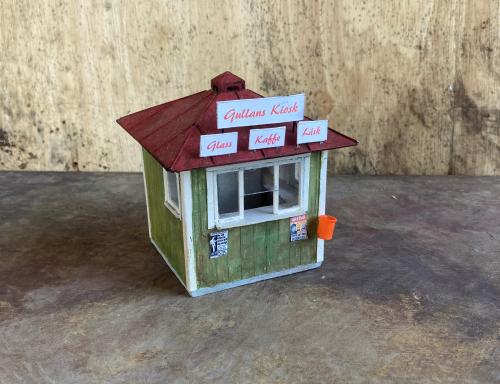 I have started making some buildings and scenic objects using simple materials, mainly cardboard and other things I have at hand, to suit the concept.