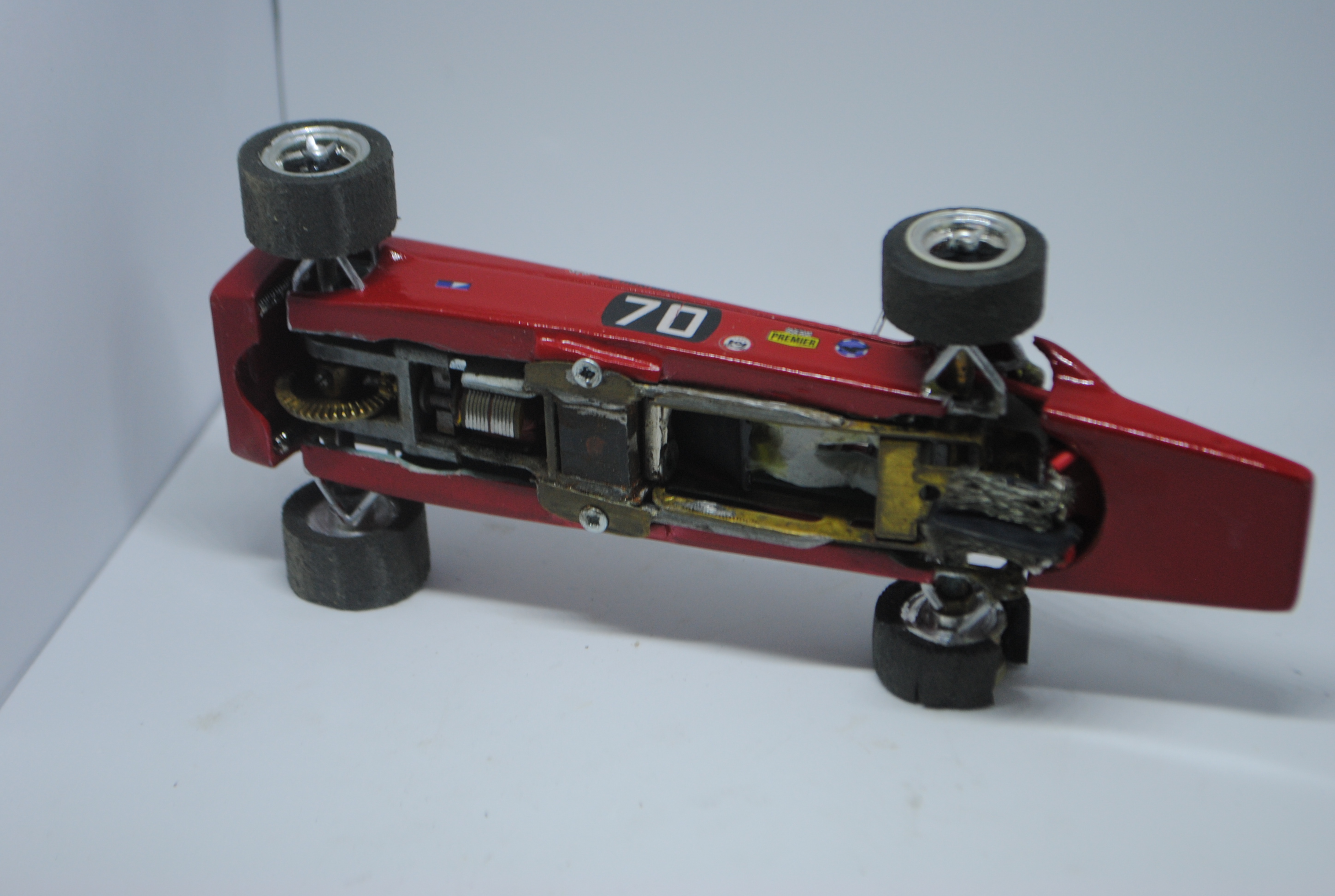 As the model is quite long and narrow, it was never going to be a world beater on a slot track, so a fairly straightforward single rail chassis with plumber pans was built,...powered by a Plafit "Cheetah" motor, with a Sonic pinion, and Parma Crown. Considering the constraints of an extremely long guide lead, and a narrow track, the car does run extremely well.
