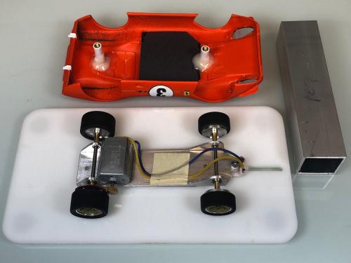 It's the old Aurora slot car body. The rounded rear wheel arches is the first clue to look for.