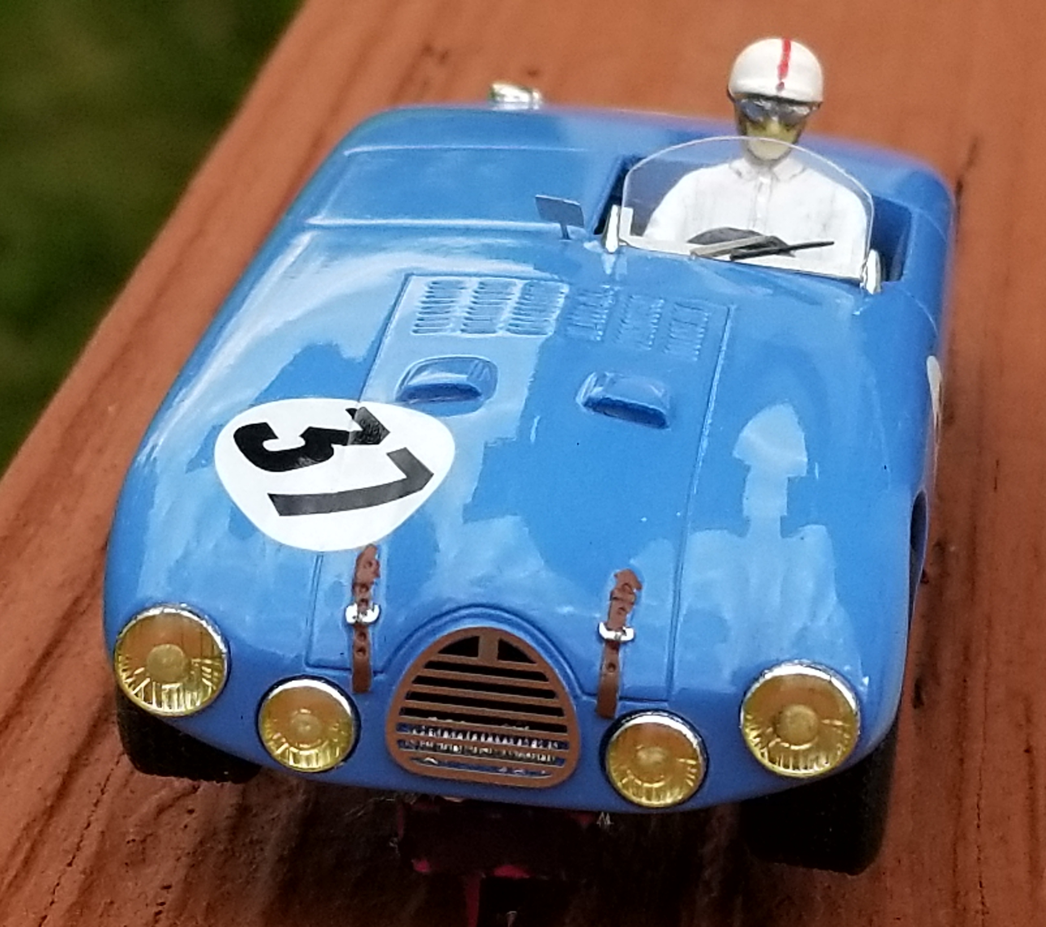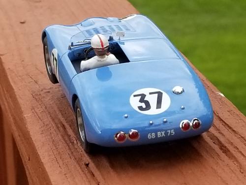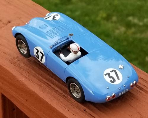 I've been in this hobby for two years, now. A buddy surprised a few of us with his track so what could we do but submit! This is my first 'scratch' build of sorts. The body is an MMK 1951 Gordini LeMans. It came with metal detail bits, spoked wheels and tires. It is very nice. I (over) built the chassis, added a digital chip then installed head-fog-tail lights using LEDs and appropriate resistors. It is heavy and sits high so doesn't run well but sure is pretty if I say so myself! MMK did a wonderful job with the resin body, paint and livery!