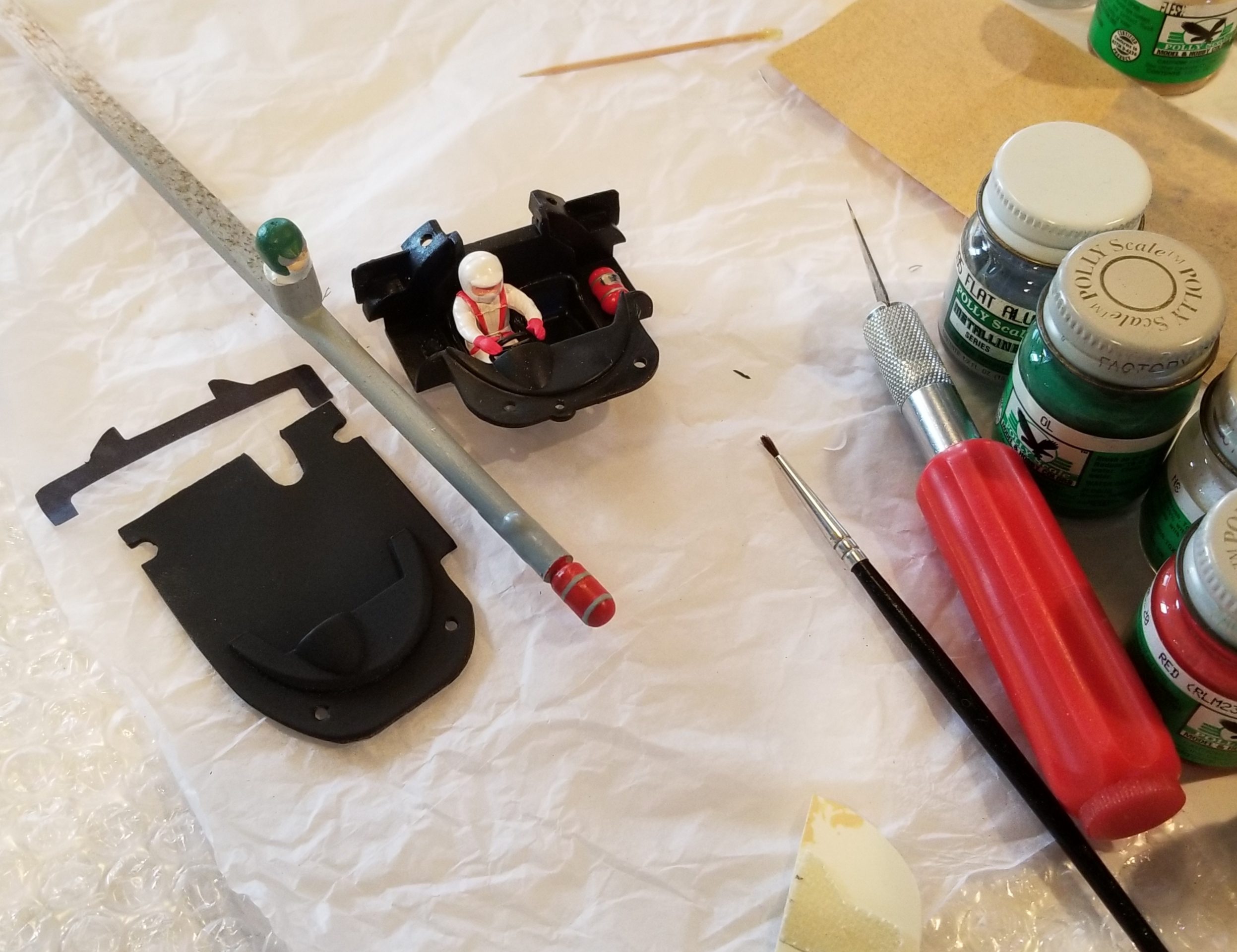 Here are more pictures. The stock cockpit was removed and replaced with a bit of styrene sheet. It was painted black and has a new driver and fire extinguisher attached. You can see them being fabricated on that stick. It weighs a few grams less than the stock item which can always be returned to its rightful place. I'll get some pics with the LED lights glowing.