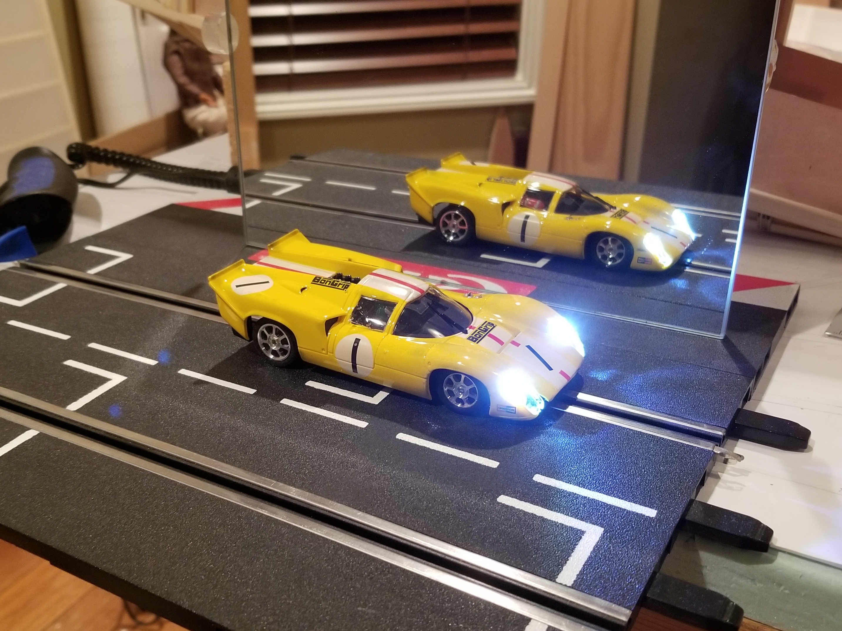 This, I believe, was my second effort of modifying an 'off shelf' car to try and get to run better. I agree with your sentiment about having a certain minimum as a driver. Yessir! There are a few liveries available. I have another 'Bon Grip', a green 'Piper' and a couple others in my 'stash'. Here are some pictures showing the LED lights and new wheels. The bright front lights hide the damage the nose end has endured! The other fellas 'fear' this car, now!